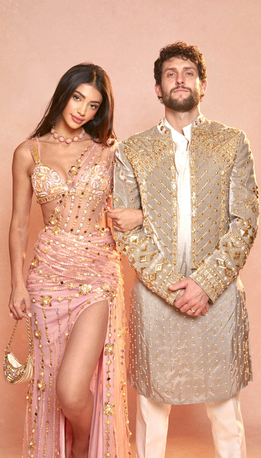 Chrissy Teigen - BISCUIT NUDE EMBELLISHED SAREE SET