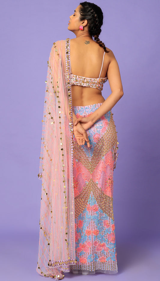 MALVIKA SITLANI - Ice Blue & Pink Pre-stiched Embellished Saree Set