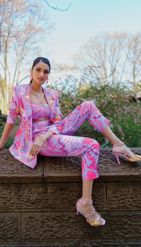 LIVING CORAL- Lilac and Hot pink sequin printed pant suit set