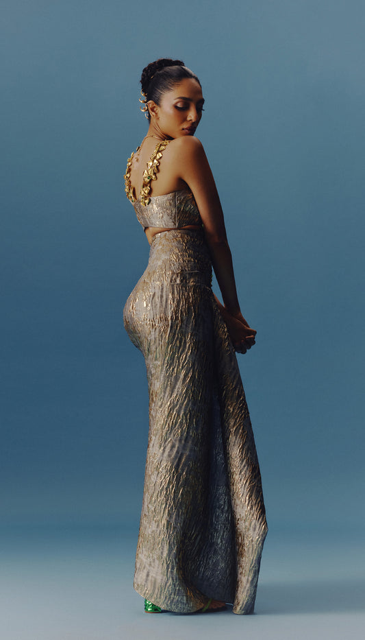 Sobhita in Gold Digger Grey Drape Skirt Set