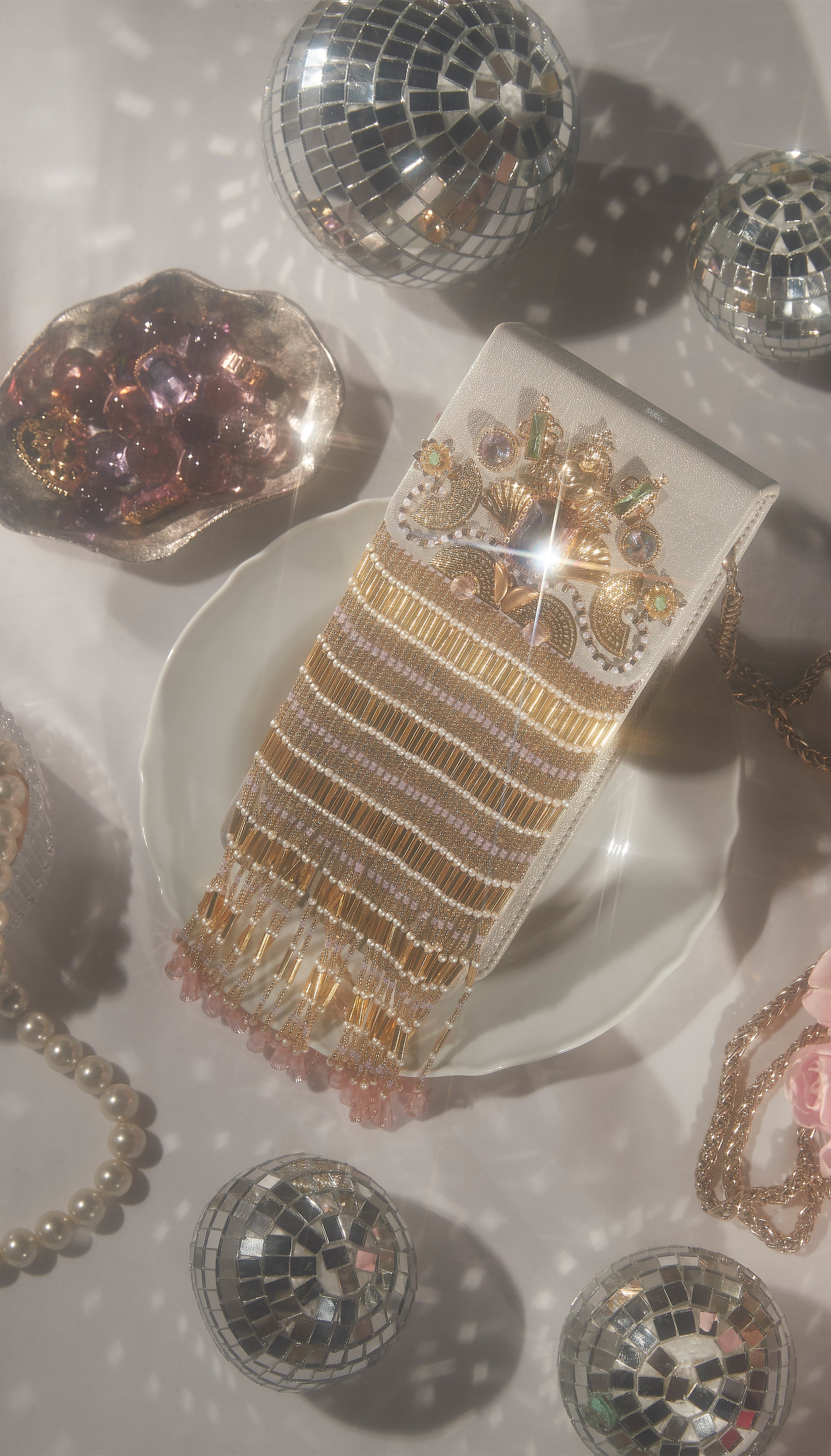 Our shimmery faux leather bag in a golden-silver hue adorned with glass stones, metal embellishments and multiple tassels made of Swarovski pearls, metal embellishments, glass beads and 24K gold elements