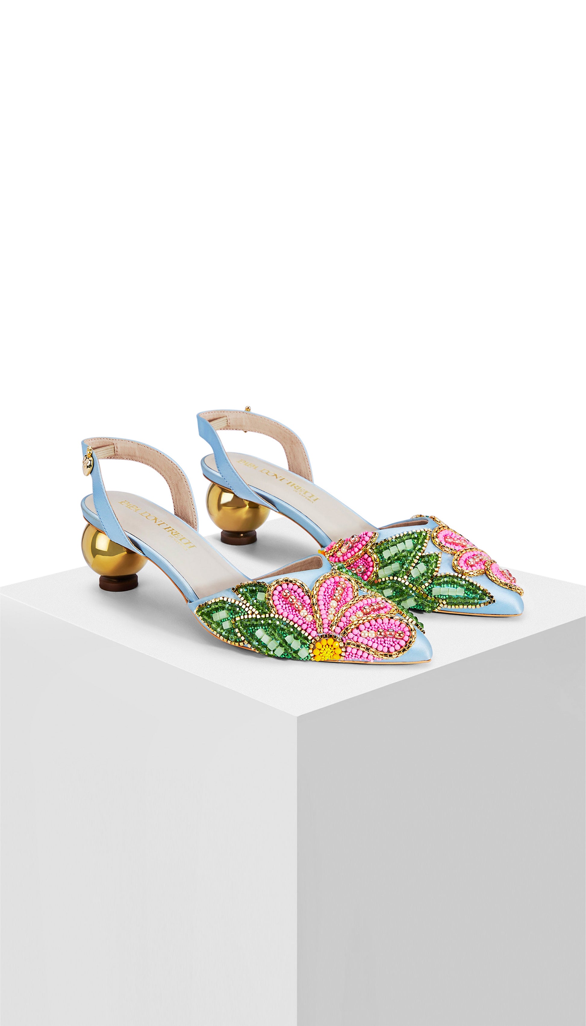 Our bougainvillea-inspired kitten heels with vapourised Gold coated stainless steel ball affixed to the heel, embroidered with glass beads to create a floral design, outlined with a snake textured chain and 24K gold plated elements.