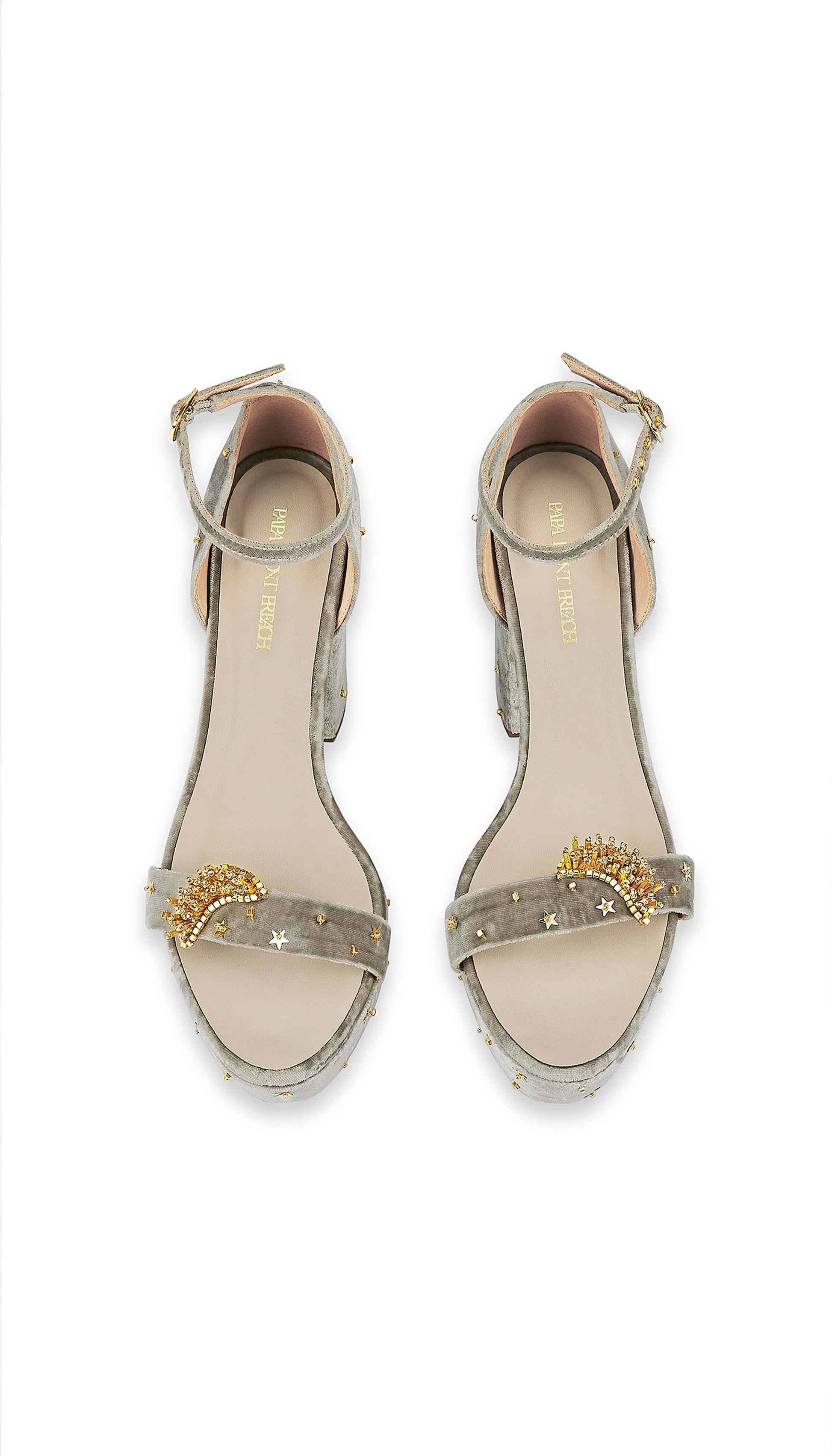 Our ankle strapped big block heels are crafted from grey velvet with gold accents. Adorned with embellishments resembling a constellation of stars on the heel and the moon on the front strap and enhanced with 24K gold plated elements.