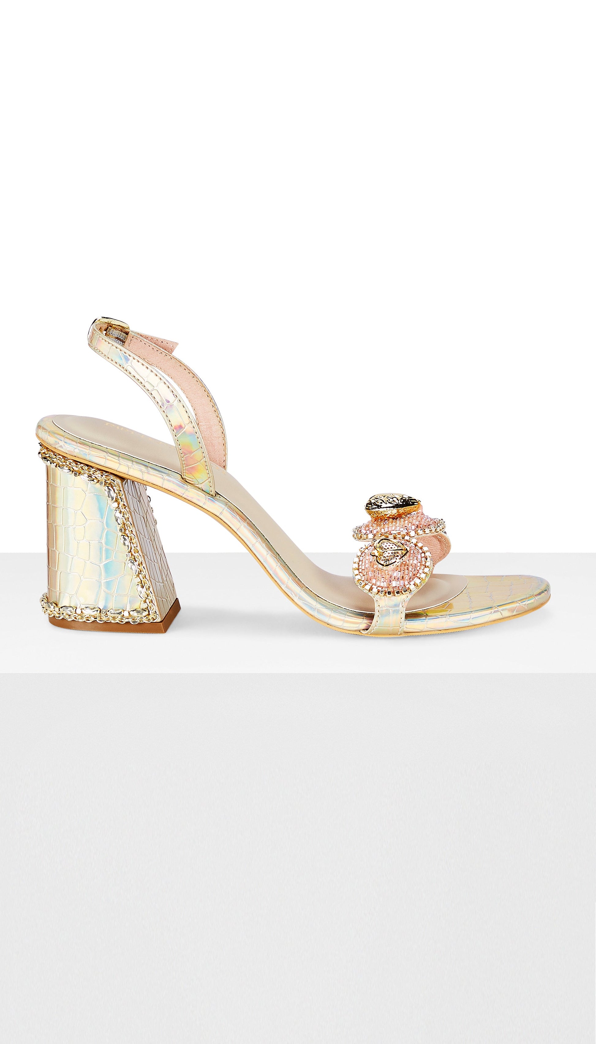 Delicious like a French macaroon, these dainty block heels, constructed in a holographic vegan leather, feature a strap made of circular treats, hand embellished with glass-cut beads and 3D gold metal hearts. And like its muse, these treats steal the show at every afternoon tea & after hours dessert binge. They come in the flavours of Lemon, Rose, Bluberry, French Vanilla, Lavender.