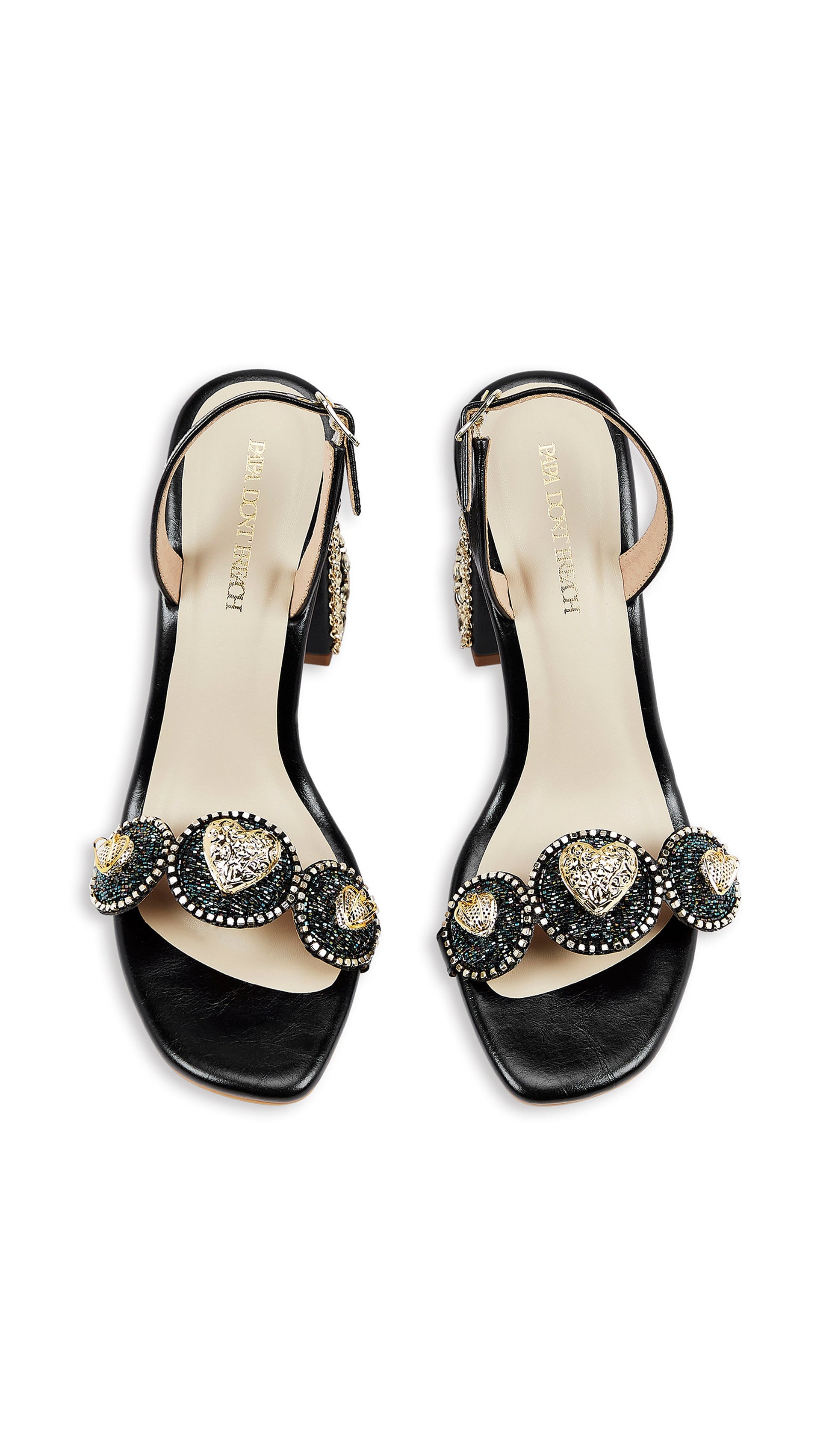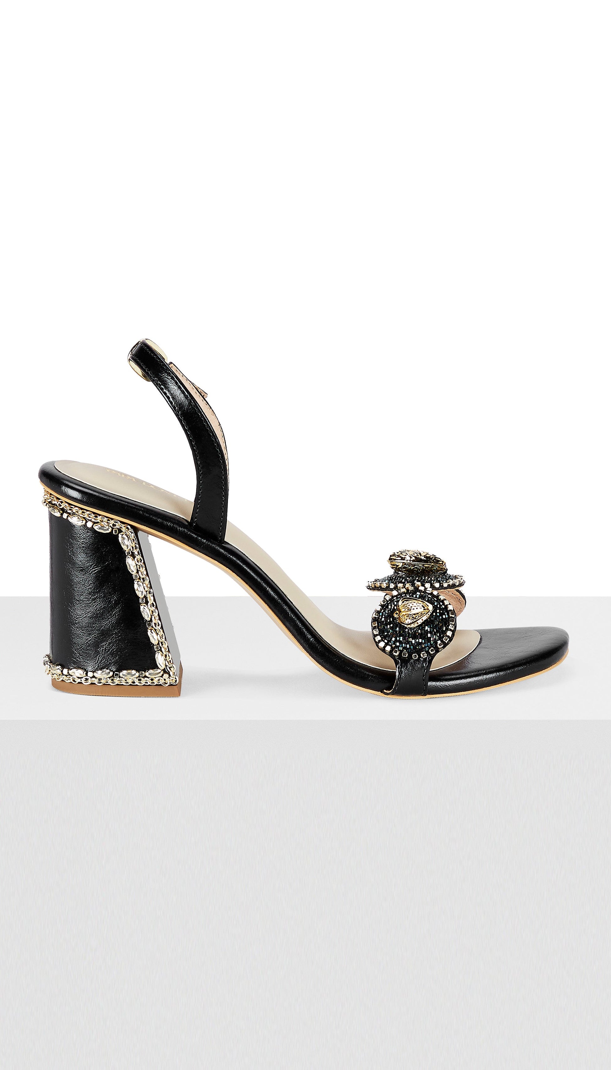 Delicious like a French macaroon, these dainty block heels, constructed in a holographic vegan leather, feature a strap made of circular treats, hand embellished with glass-cut beads and 3D gold metal hearts. And like its muse, these treats steal the show at every afternoon tea & after hours dessert binge. They come in the flavours of Lemon, Rose, Bluberry, French Vanilla, Lavender.