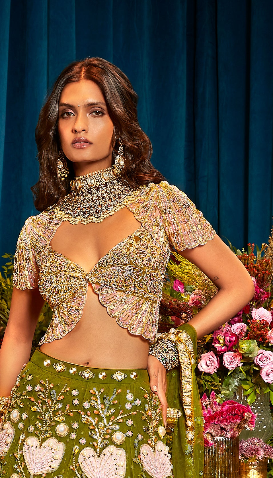 Signature blouse in a delightful combination of pink and olive tulle, adorned with shimmering sequins, luxurious metals, and sparkling crystals.