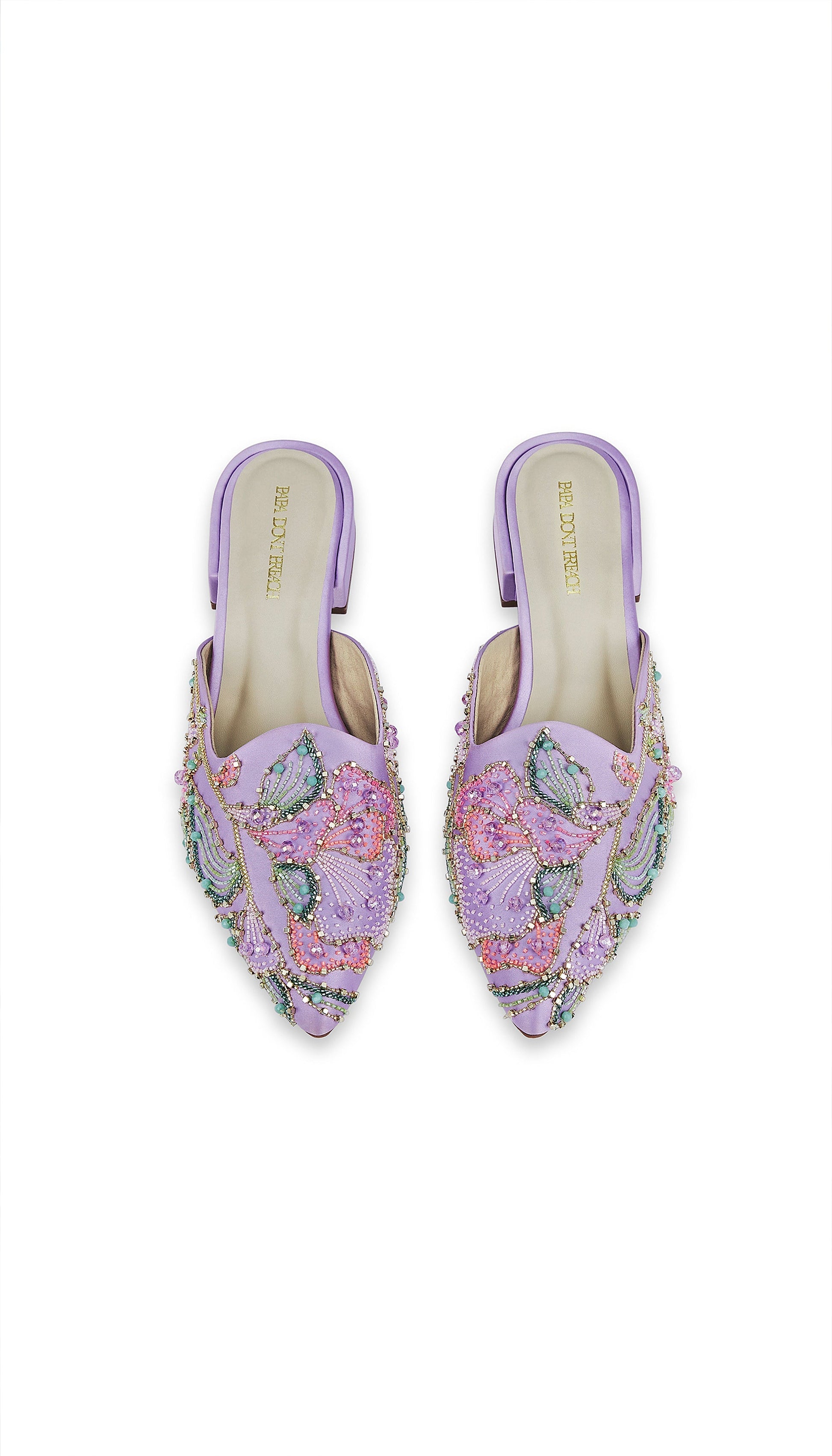 Introducing Papa Don't Preach Mules! Our lilac mule features a floral design embellished with cut beads and glass beads.