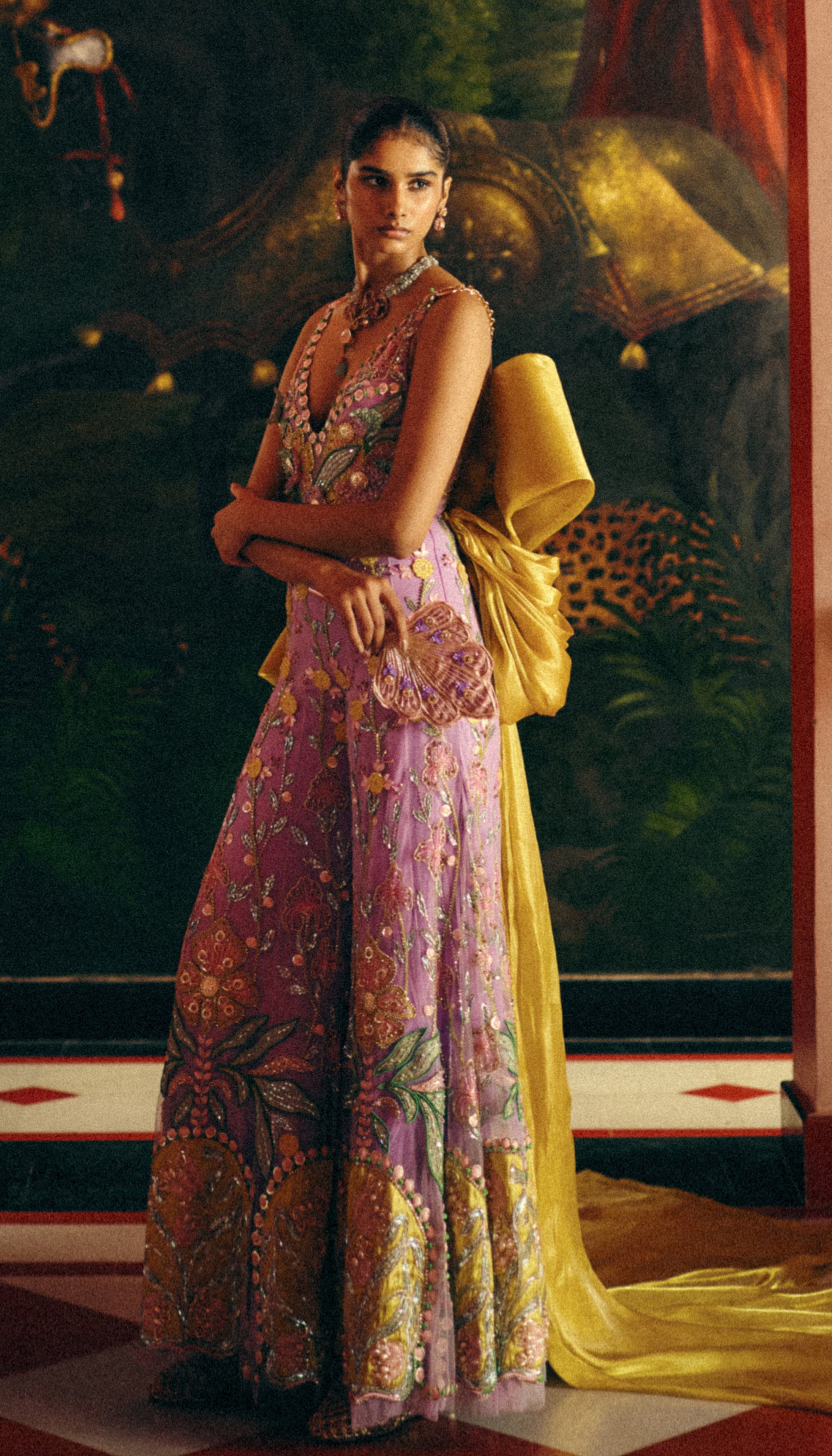 A hand-embroidered jumpsuit featuring a deep V-neckline with vertical floral embroidery that elongates the silhouette. The look is elevated with an exaggerated draped bow and a sweeping trail at the back, adding a dramatic yet graceful finish.