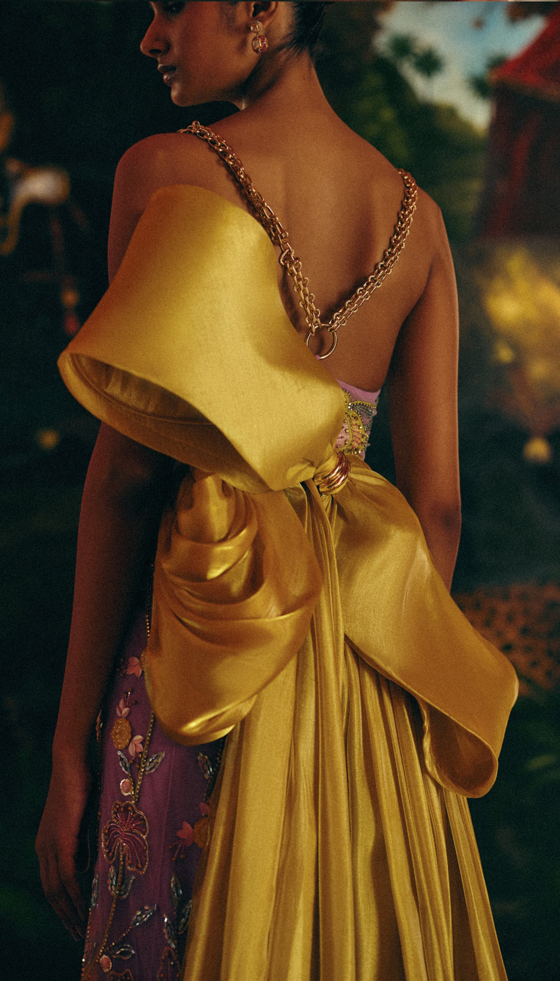 Jumpsuit with a plunging neckline featuring patchwork embroidery, and a metallic chain coming at the back along with a detachable bow with a long trail