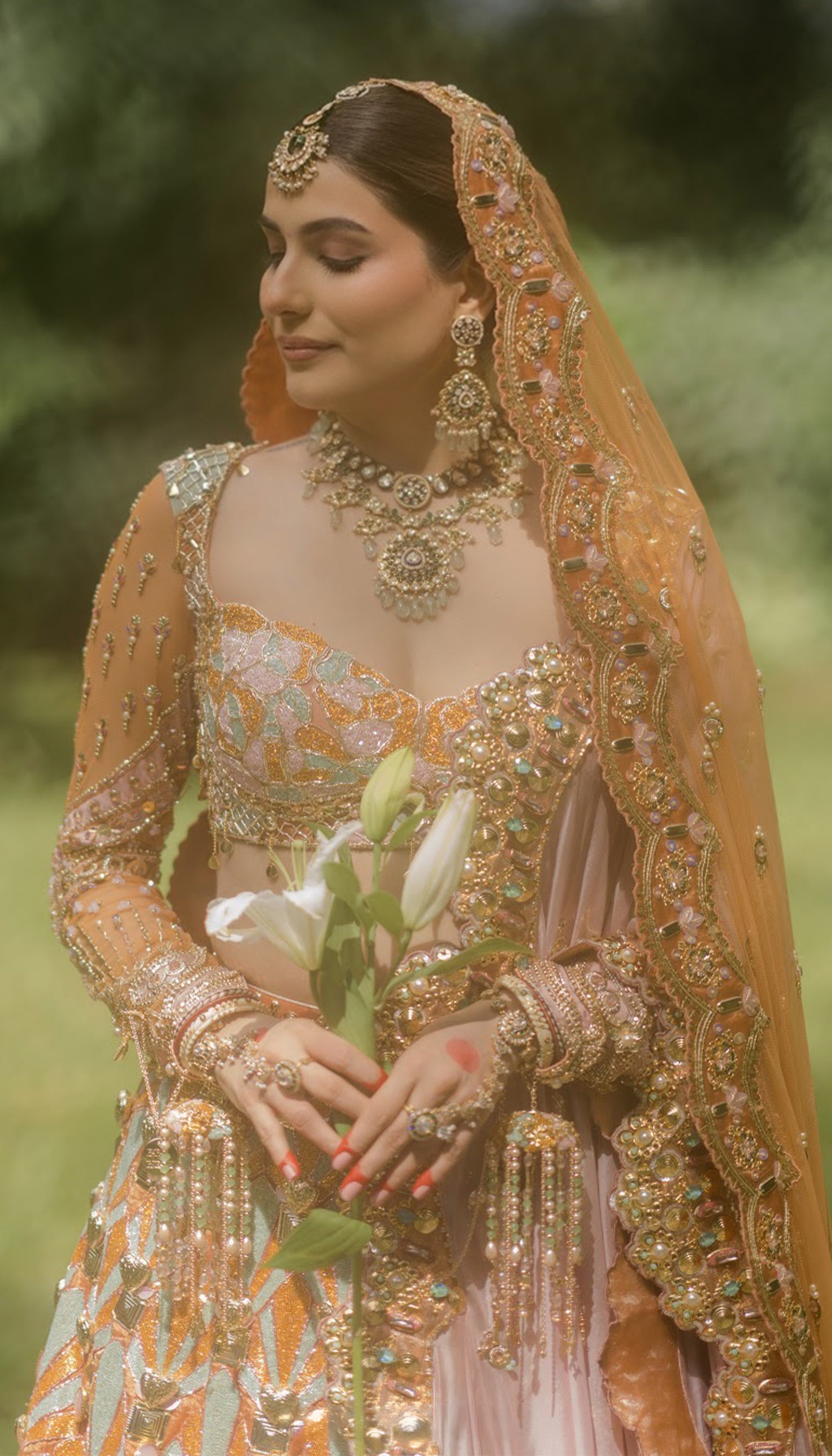 A radiant ode to traditional grandeur, this handcrafted rust orange lehenga features intricate embroidery inspired by Indian architectural motifs, brought to life in a palette of peach, apricot, and seafoam tones. Meticulously adorned with glasscut beads, stones, sequins, acrylics, metal accents, and crystals, every panel narrates a story of artisanal excellence. The structured blouse with full-sleeved detailing is paired with an ethereal scalloped dupatta in a soft pink hue—framed with ornate hand-embellished borders and a delicately embroidered tulle rust dupatta. Romantic yet regal, this ensemble celebrates the modern bride who carries tradition with luminous grace.