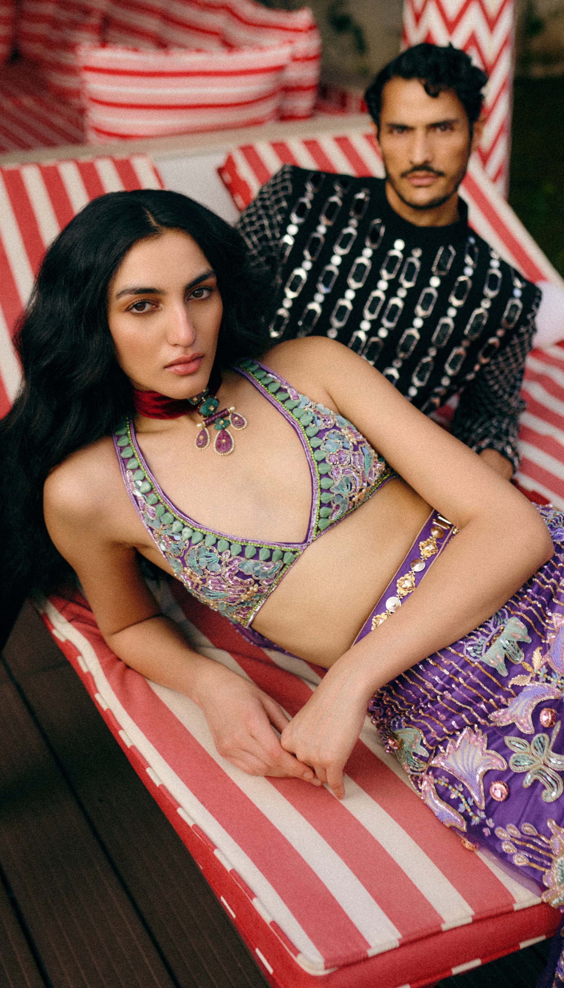 A striking purple fish-cut lehenga featuring intricate patchwork in green, pink, and ivory satin. The surface is richly embellished with acrylics, crystals, glass-cut beads, and metal accents, creating a vibrant play of texture and shine. Paired with a purple tulle halter-neck bralette and two cascading tulle dupattas attached to the blouse, this look exudes contemporary glamour with a whimsical twist.