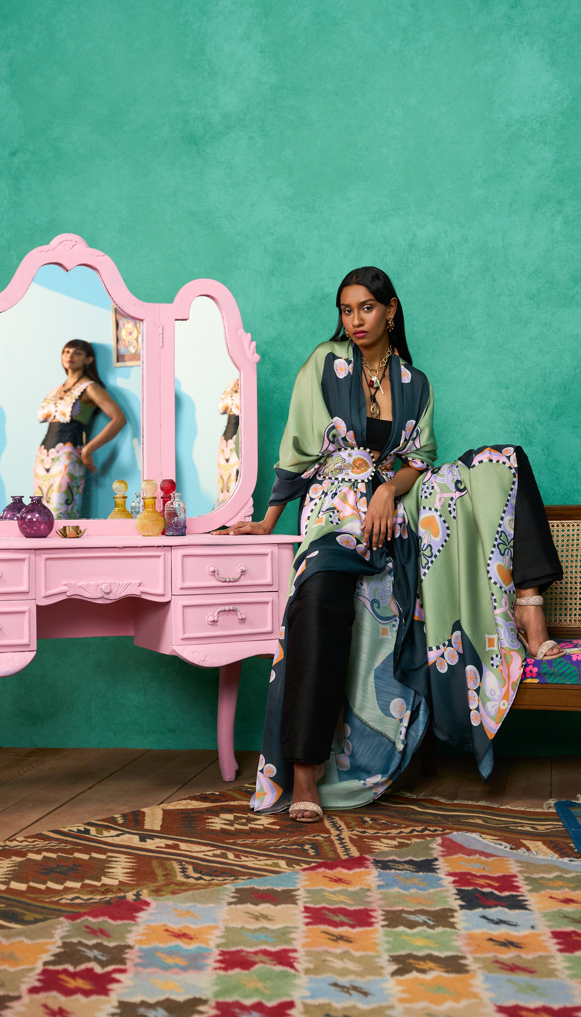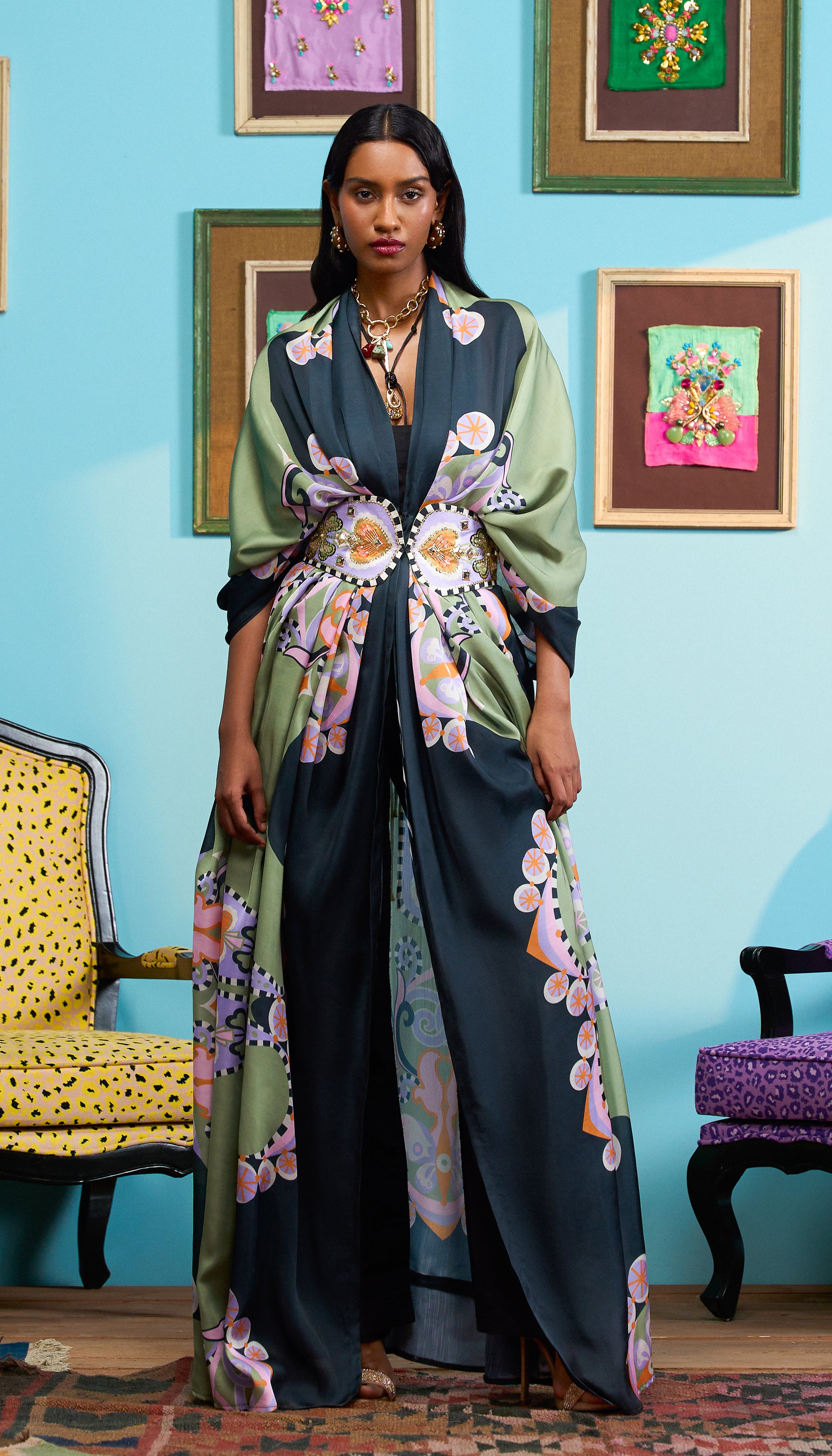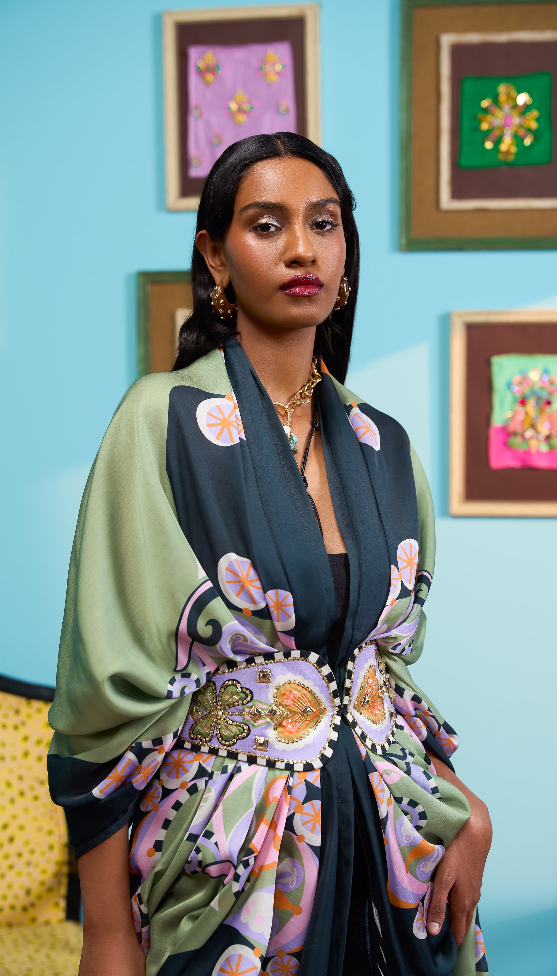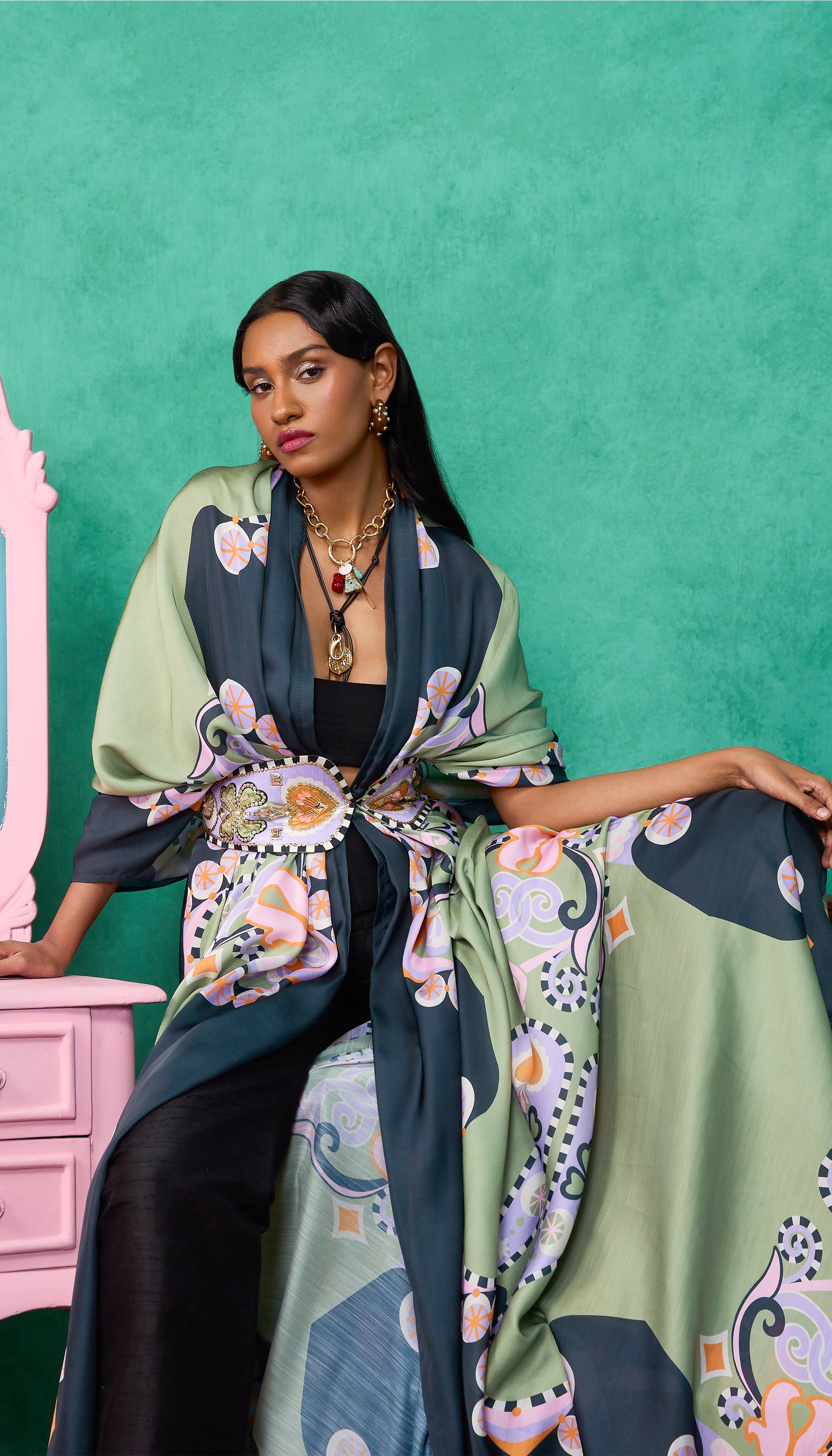 A printed satin linen draped jacket featuring an attached embroidered belt, seamlessly blending modern style with intricate detailing for a chic, sophisticated look..