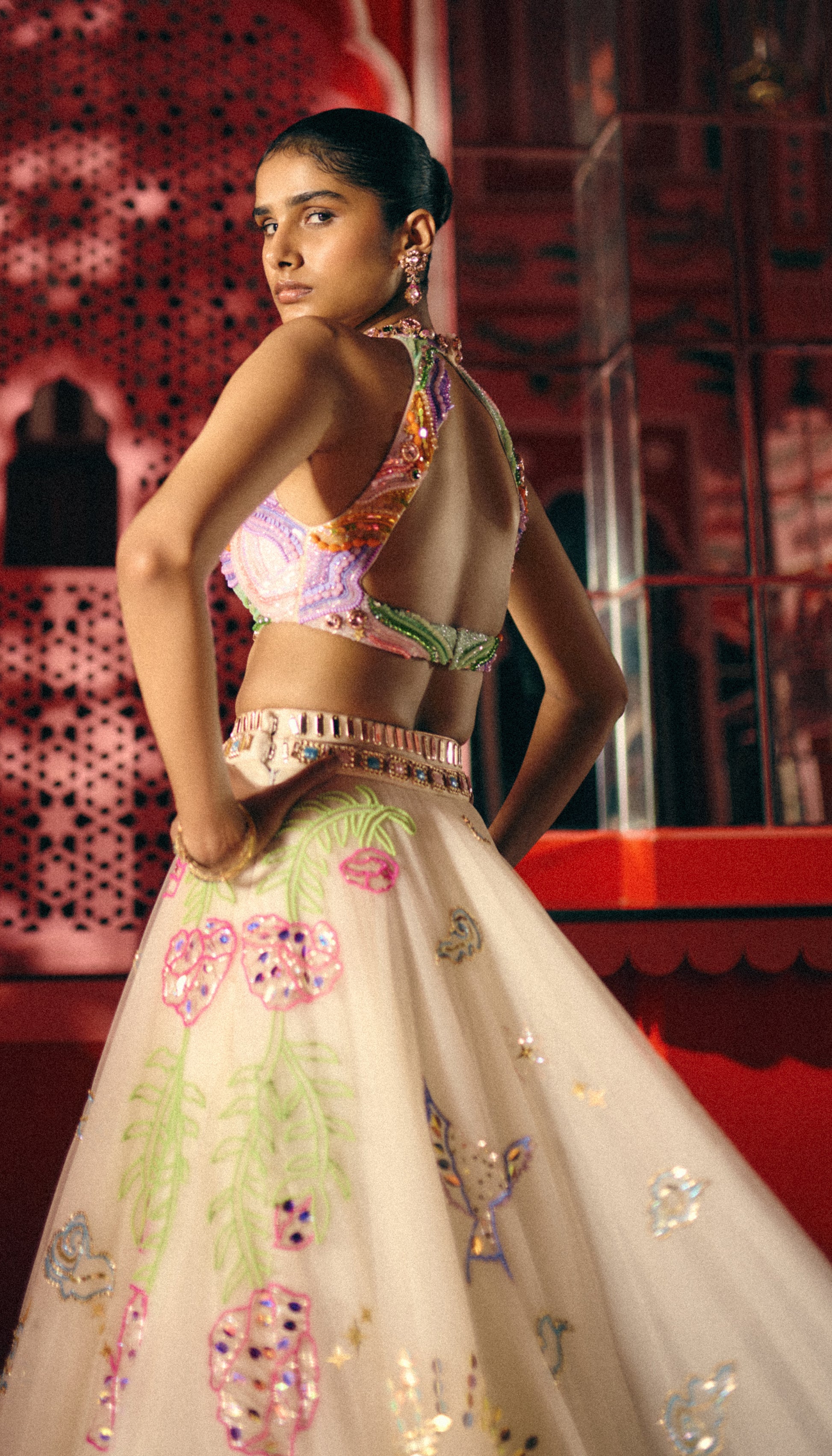 Multi layered ivory lehenga with a high low effect and a double belt, paired with a multicolour embroidered blouse