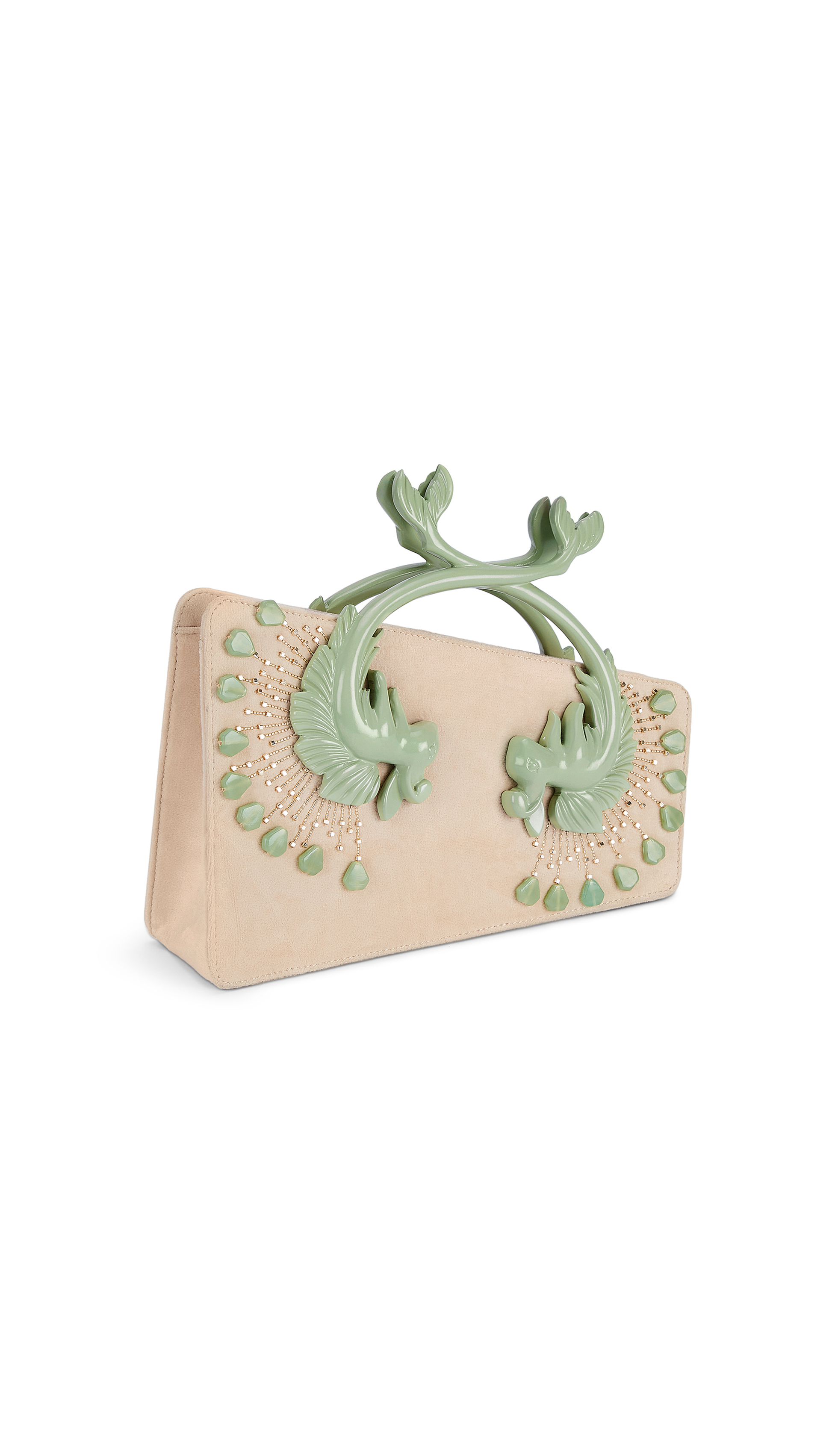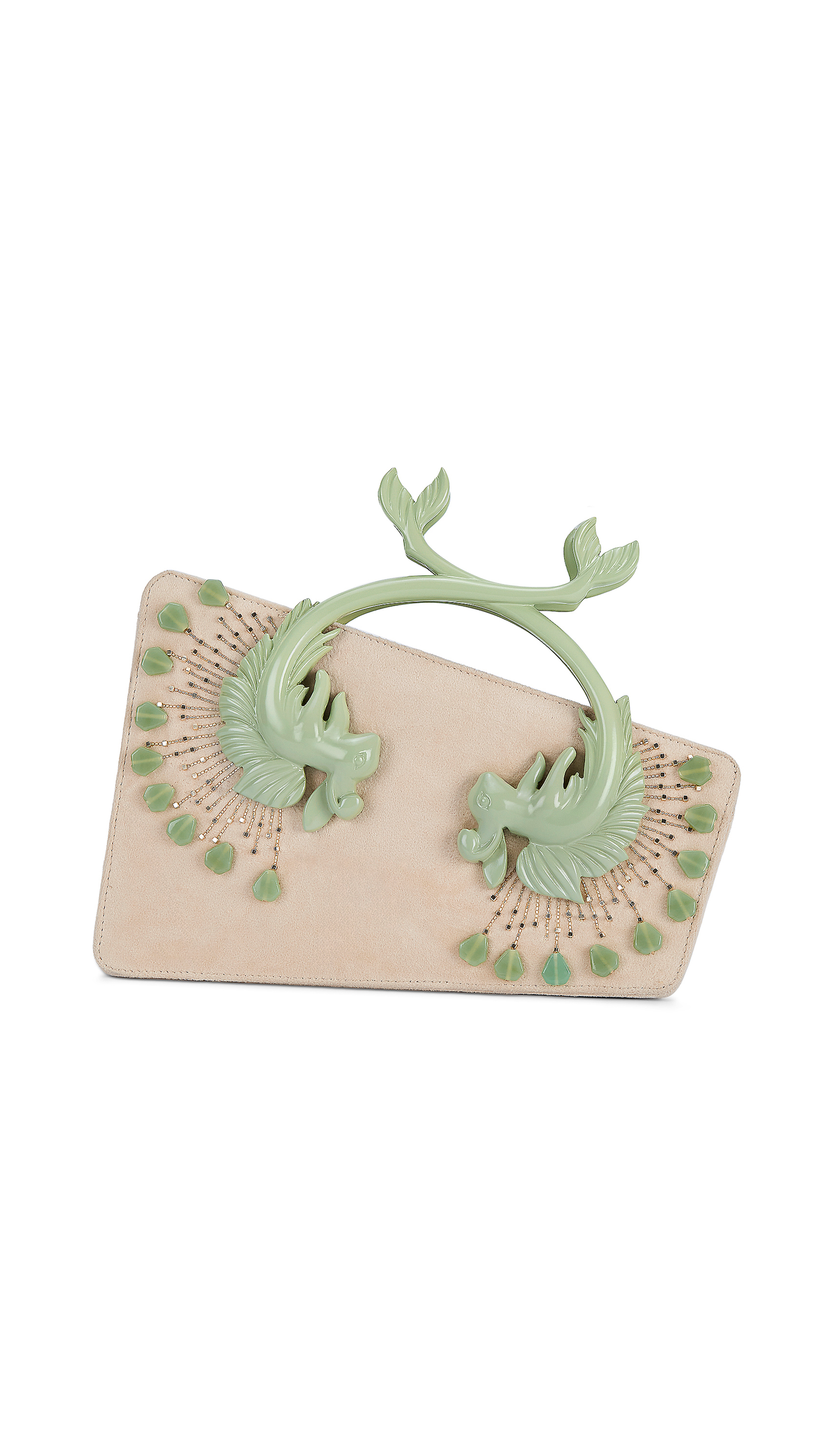 A diagonal body of cream velvet becomes a stage for two mer-bunnies, their emerald tails entwining into a handle of destiny. Behind them, crystal rays scatter like captured starlight, illuminating the scene with quiet magic. At its edge, a single green stone drops like dew at dawn — the final touch to a relic that feels less like a bag, more like a myth carried in hand.