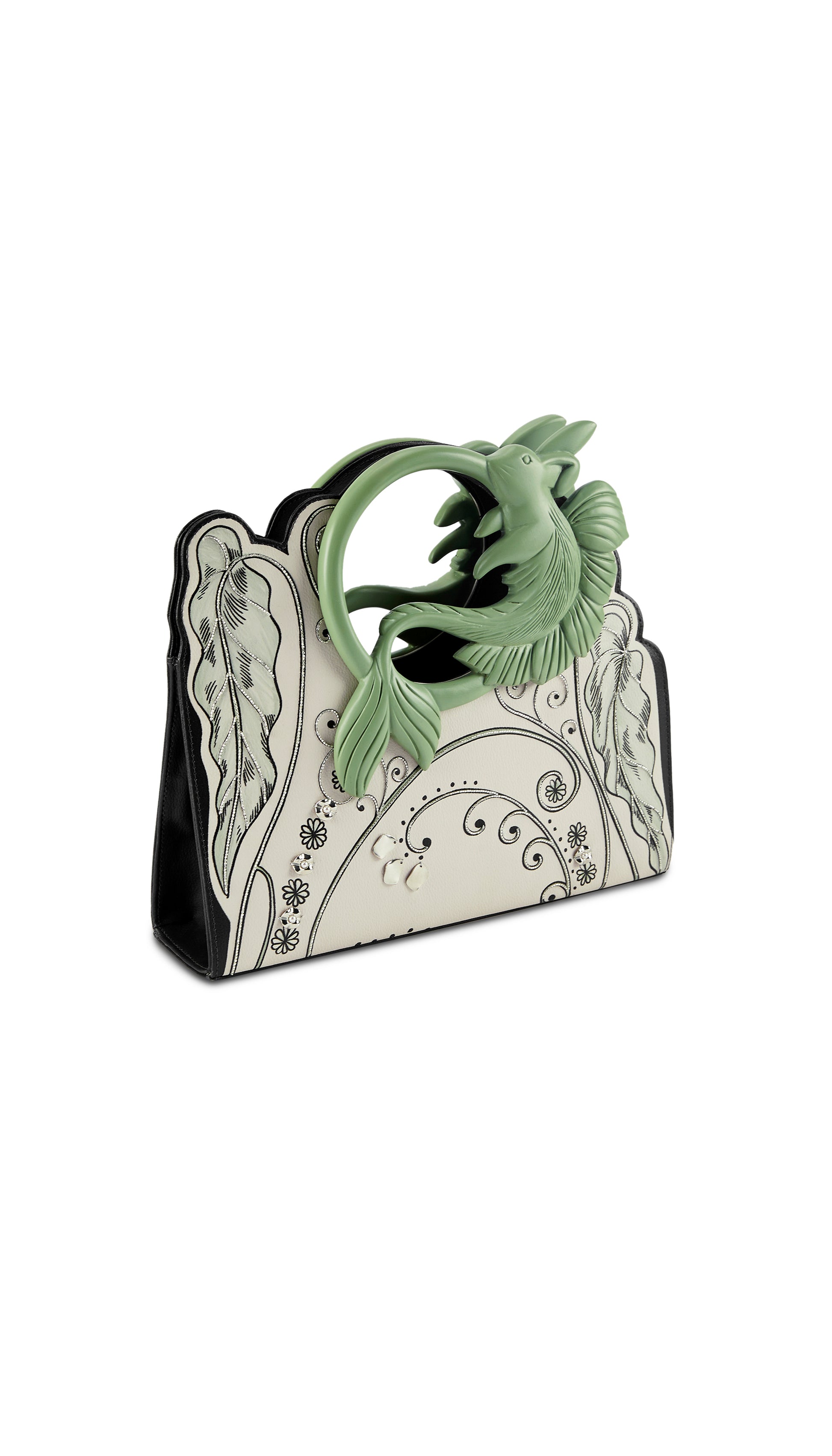 Structured in black and cream faux leather, the bag shimmers with silver cardana embroidery, stitched into swirling vine patterns that catch the light like moonlit leaves. Crowning it, a green mer-bunny handle stands as its whimsical guardian — a surreal touch against the polished form. A piece that feels both sculptural and enchanted, like a treasure carried out of a fairytale forest.