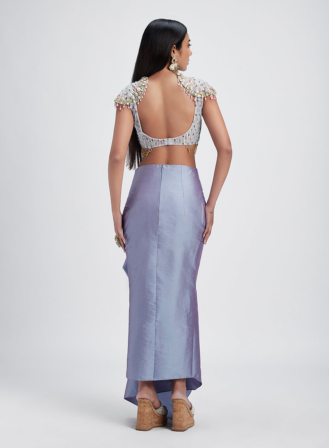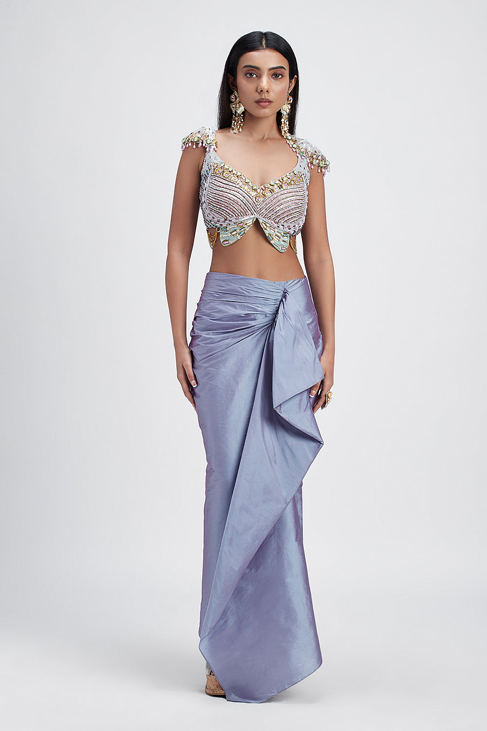 A signature papa dont preach draped tafetta skirt along with a blouse embellished with silver and pink metallic embroidery