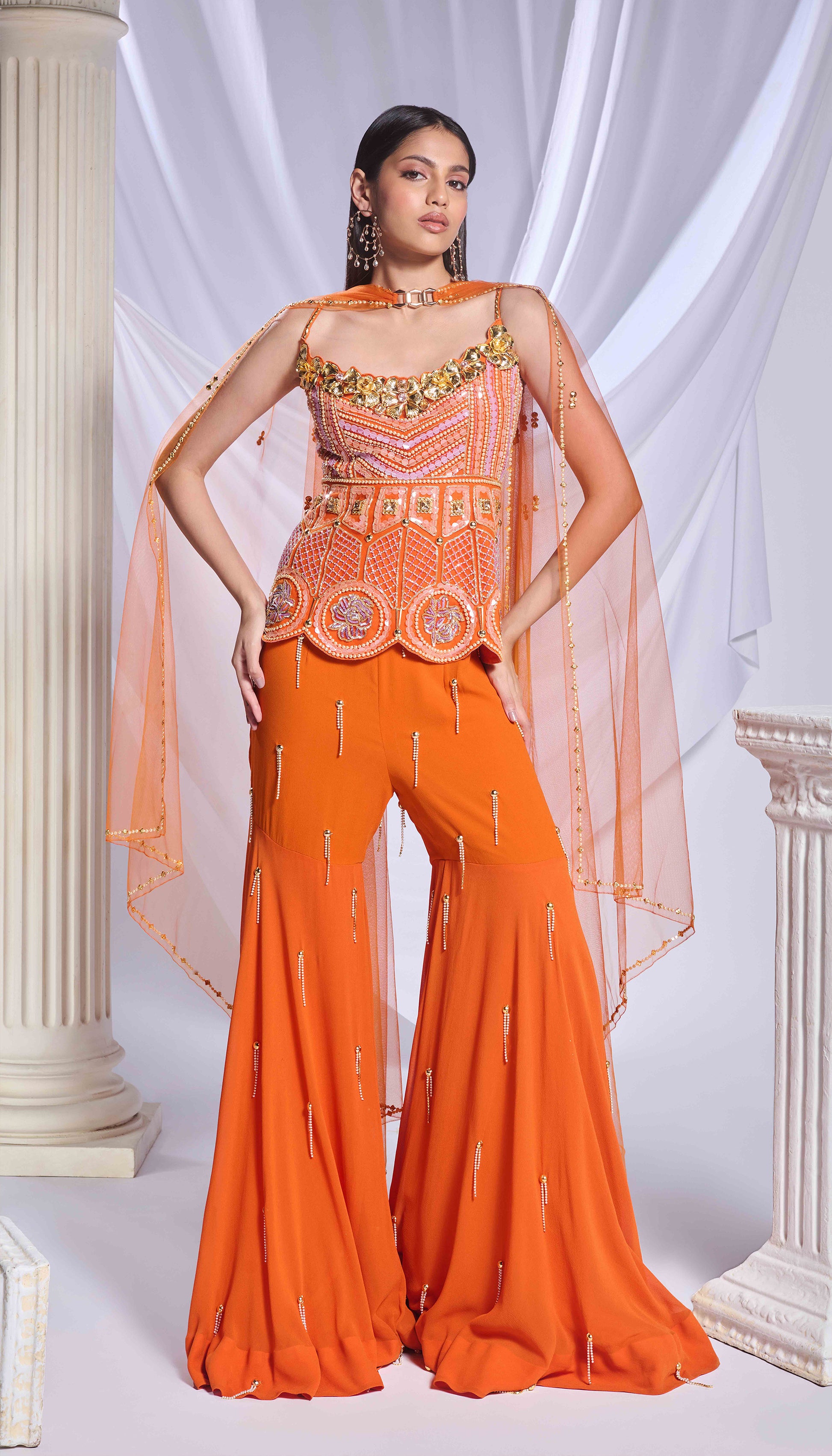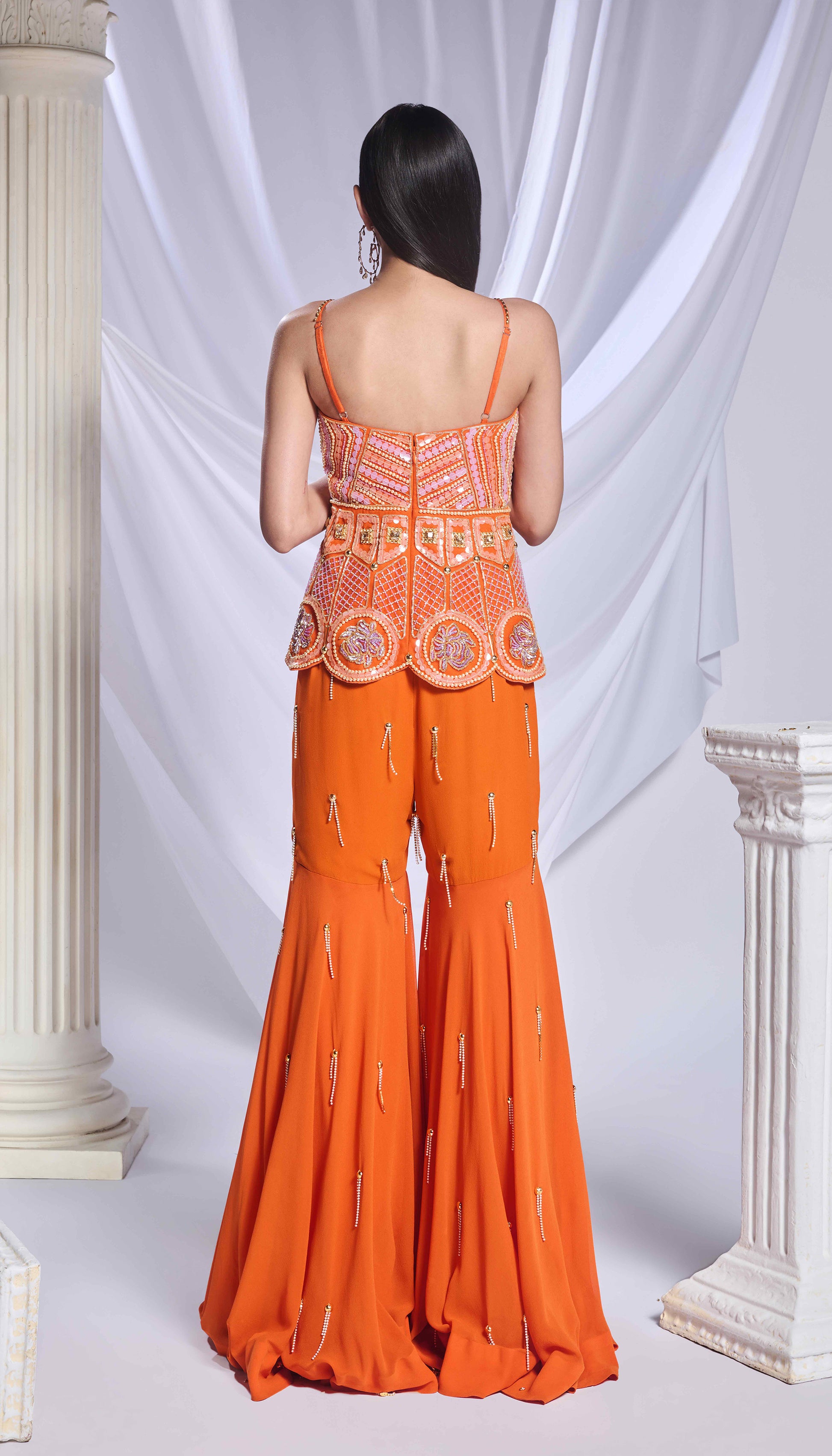 Our burnt orange 3-piece sharara set comprises of a peplum top, sharara, and dupatta. The peplum top is adorned with delicate embroidery featuring crystals, pearls, and sequins, alongside gold metallic flowers embellishing the front neckline and scalloped hem. The georgette sharara is bejewelled with crystal tassels. Completing the ensemble is a matching dupatta, embellished with scatter embroidery and finished with a delicate pearl and golden border.