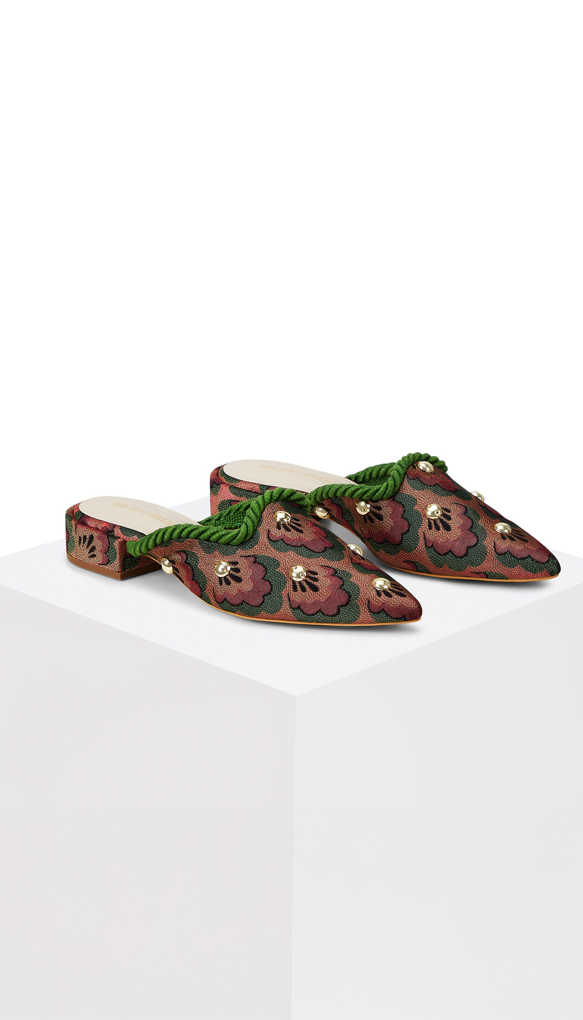Golden Hour captures the drama of dusk in a mule. Rendered in a vibrant mix of red, green, and gold print fabric, the pair glimmers with 24K gold-plated metal accents and is finished with a delicate green cord detail at the front. A versatile statement, designed to turn every occasion into its own radiant moment.