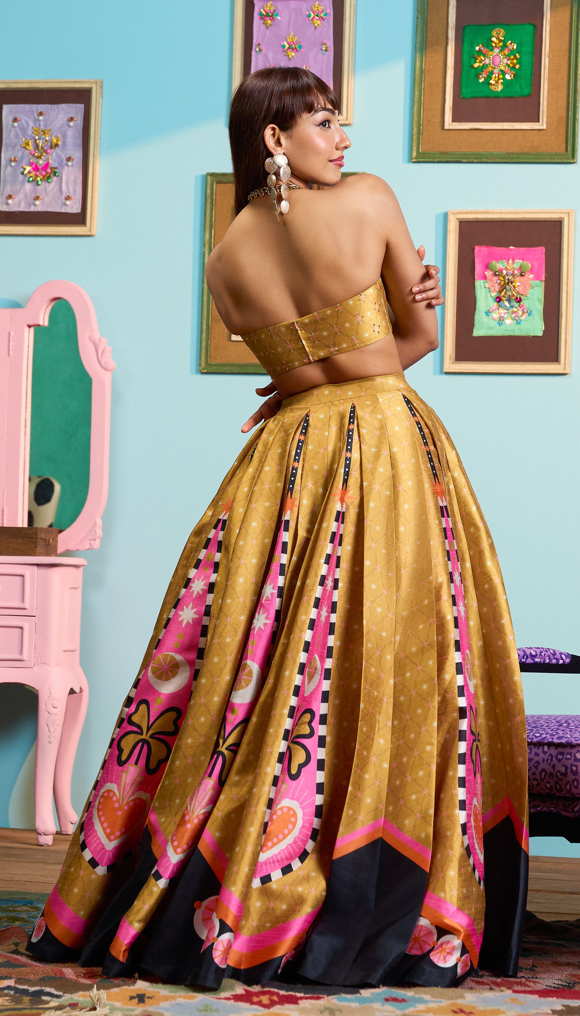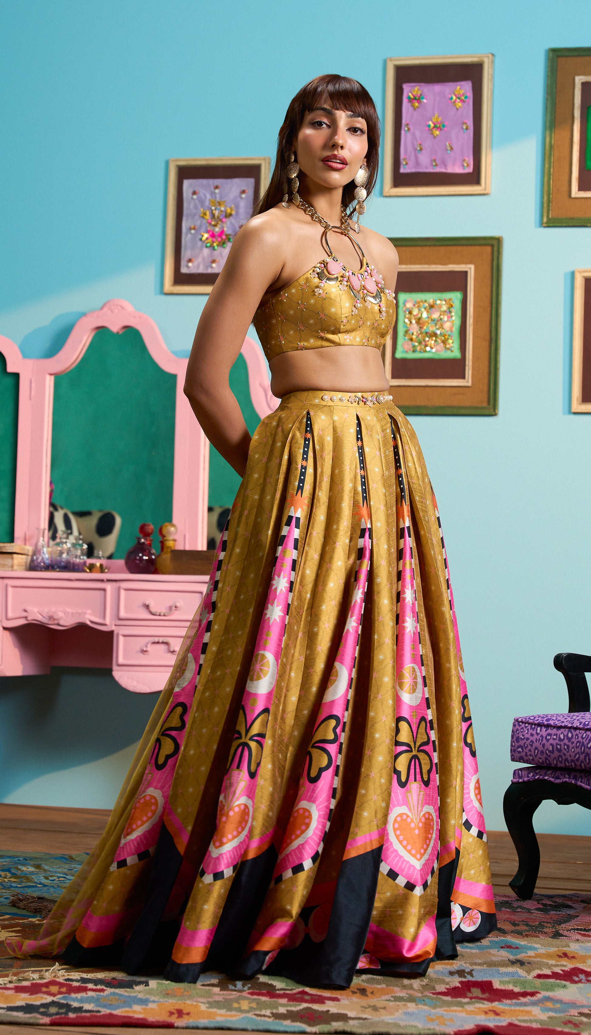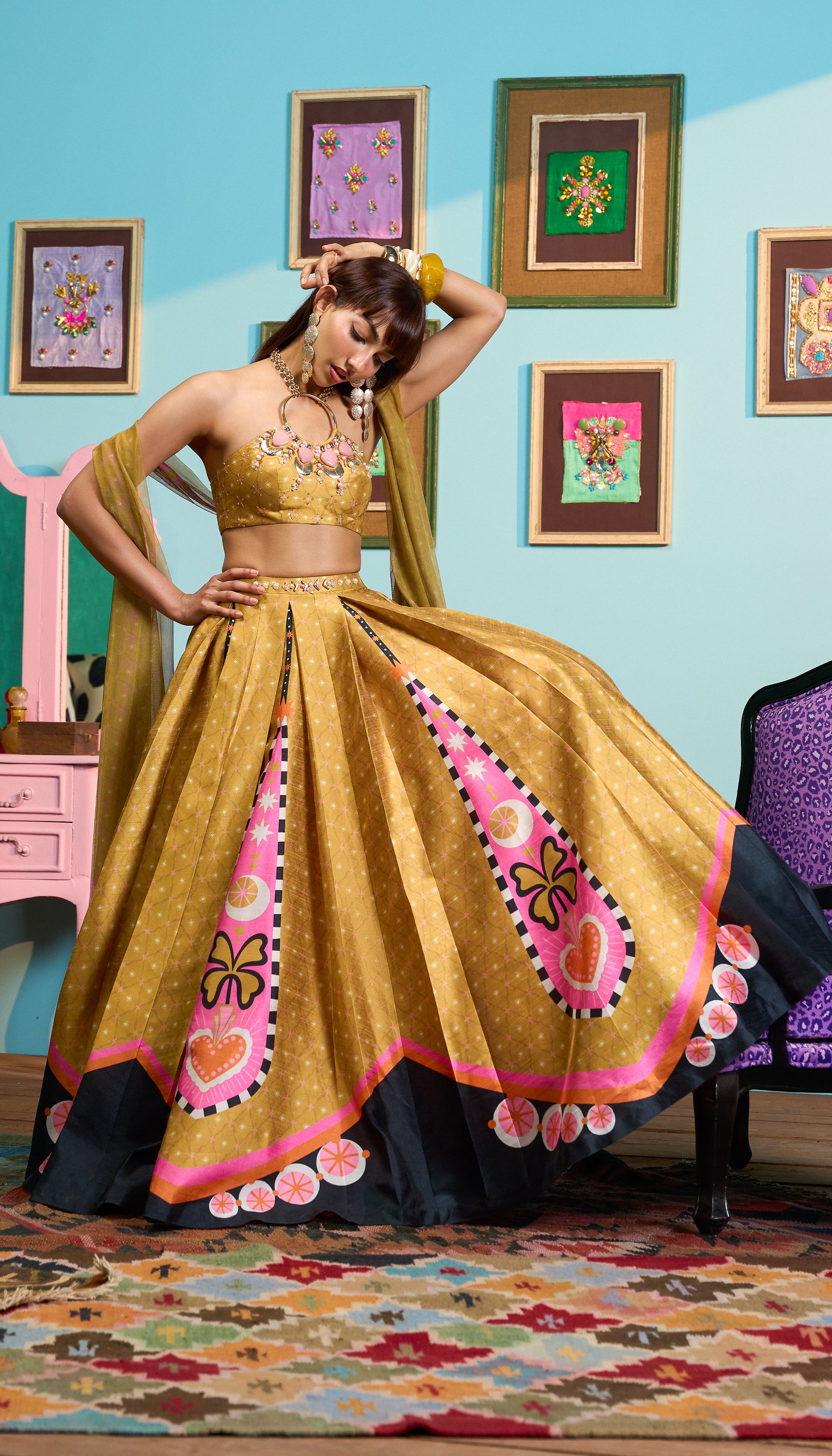 Product InformationA raw silk printed box pleated lehenga paired with a raw silk embroidered blouse, complemented by a delicate tulle dupatta.