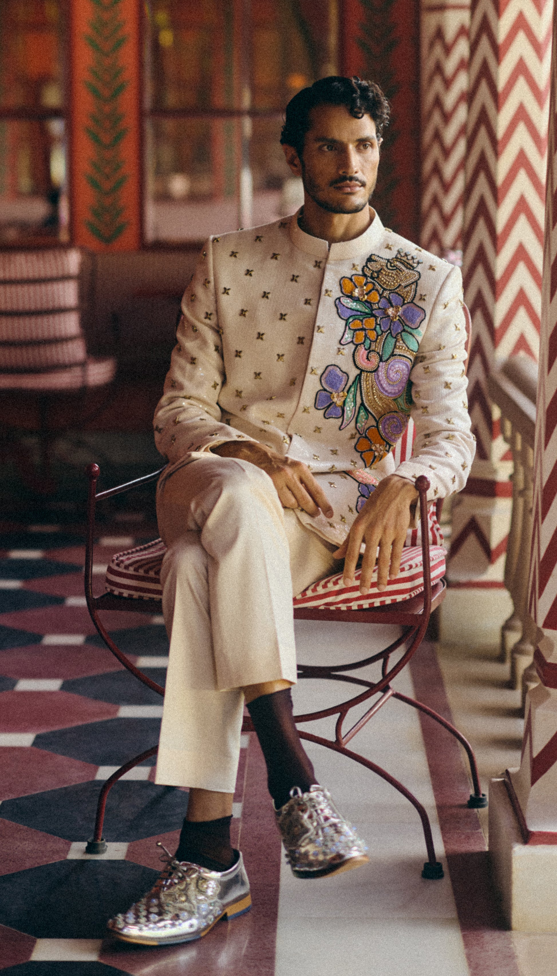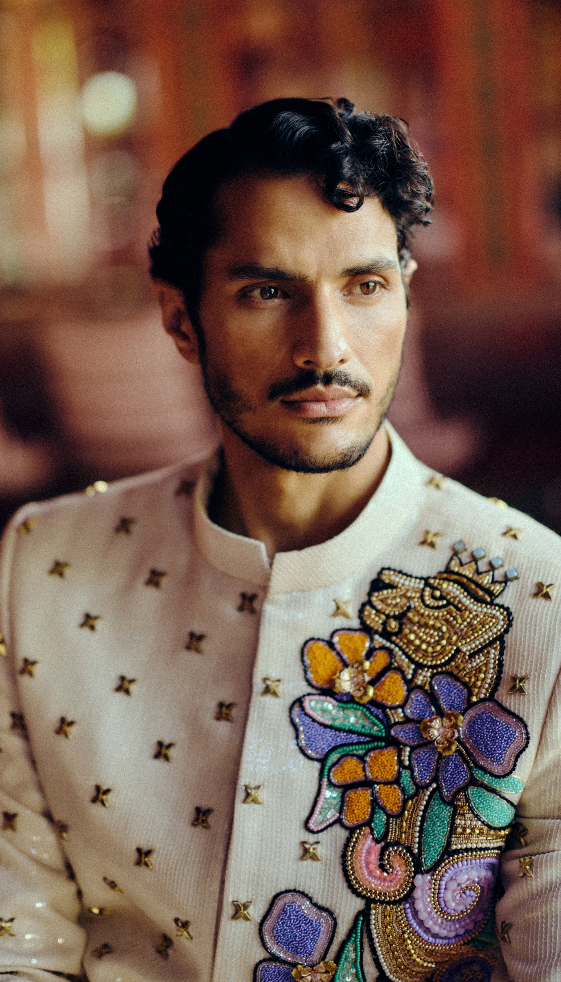 Asymmetrical floral embroidery placement that adds a pop of color to the otherwise minimal golden sequin base.
