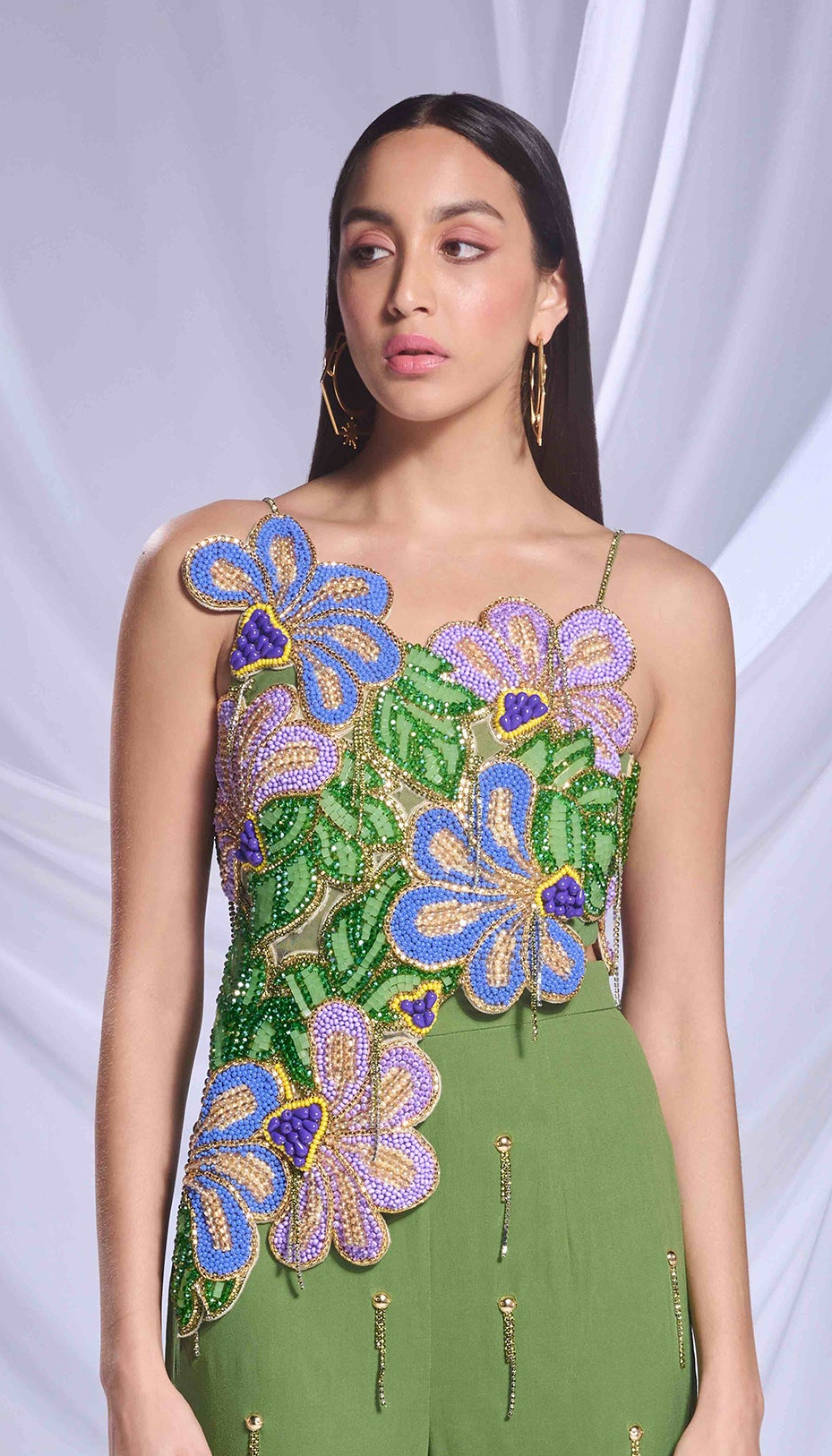 One shoulder top in moss green, heavily adorned with hand embroidered 3D flowers, beads and crystals.