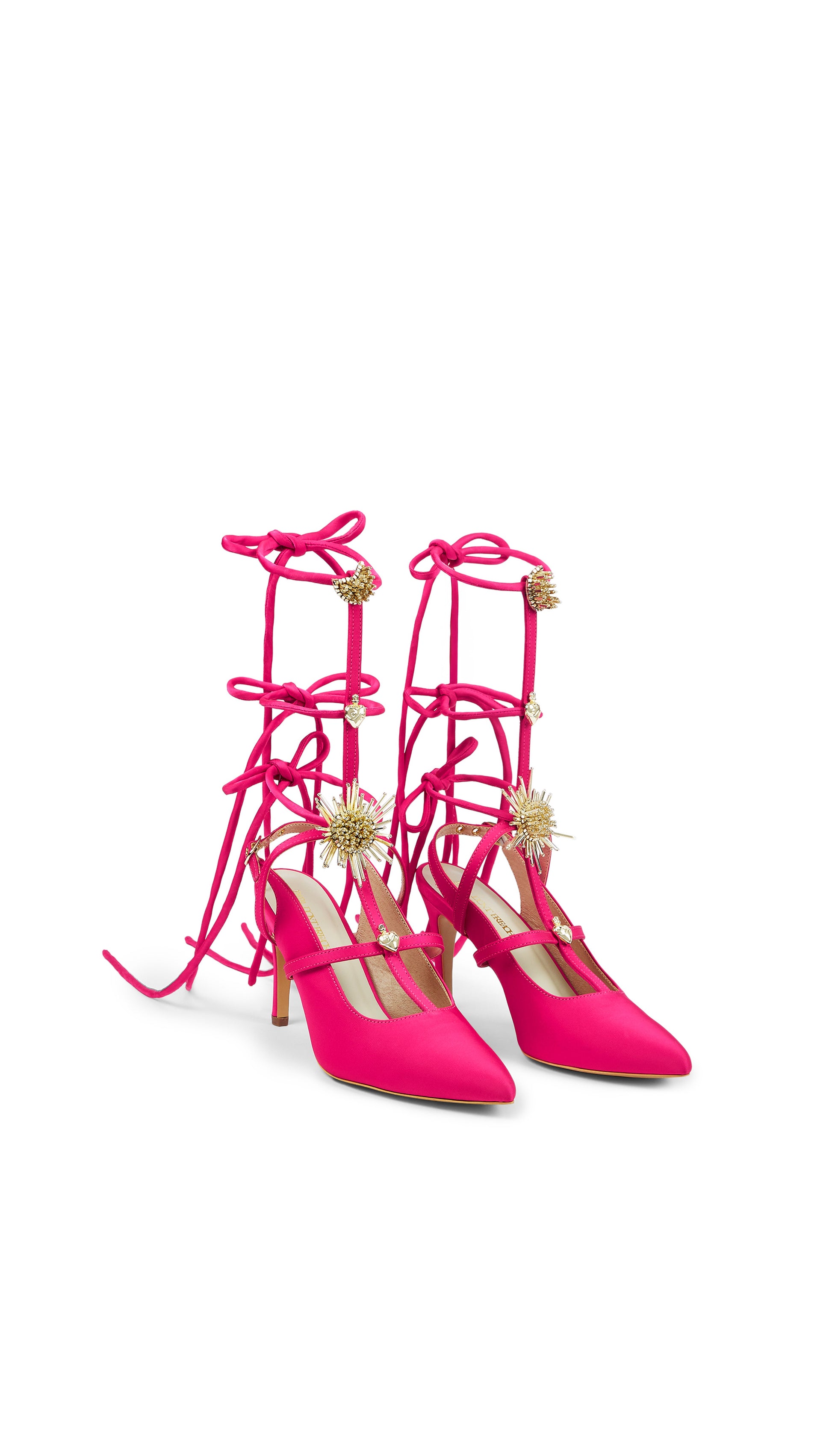 Hot pink, high voltage. Kiss My Cosmos is a tie-up heel embroidered with celestial detail and finished with charms that orbit you — the sun, the moon, and our signature brass heart. It’s unapologetically extra, deliberately cosmic, and designed to light up every function you walk into.