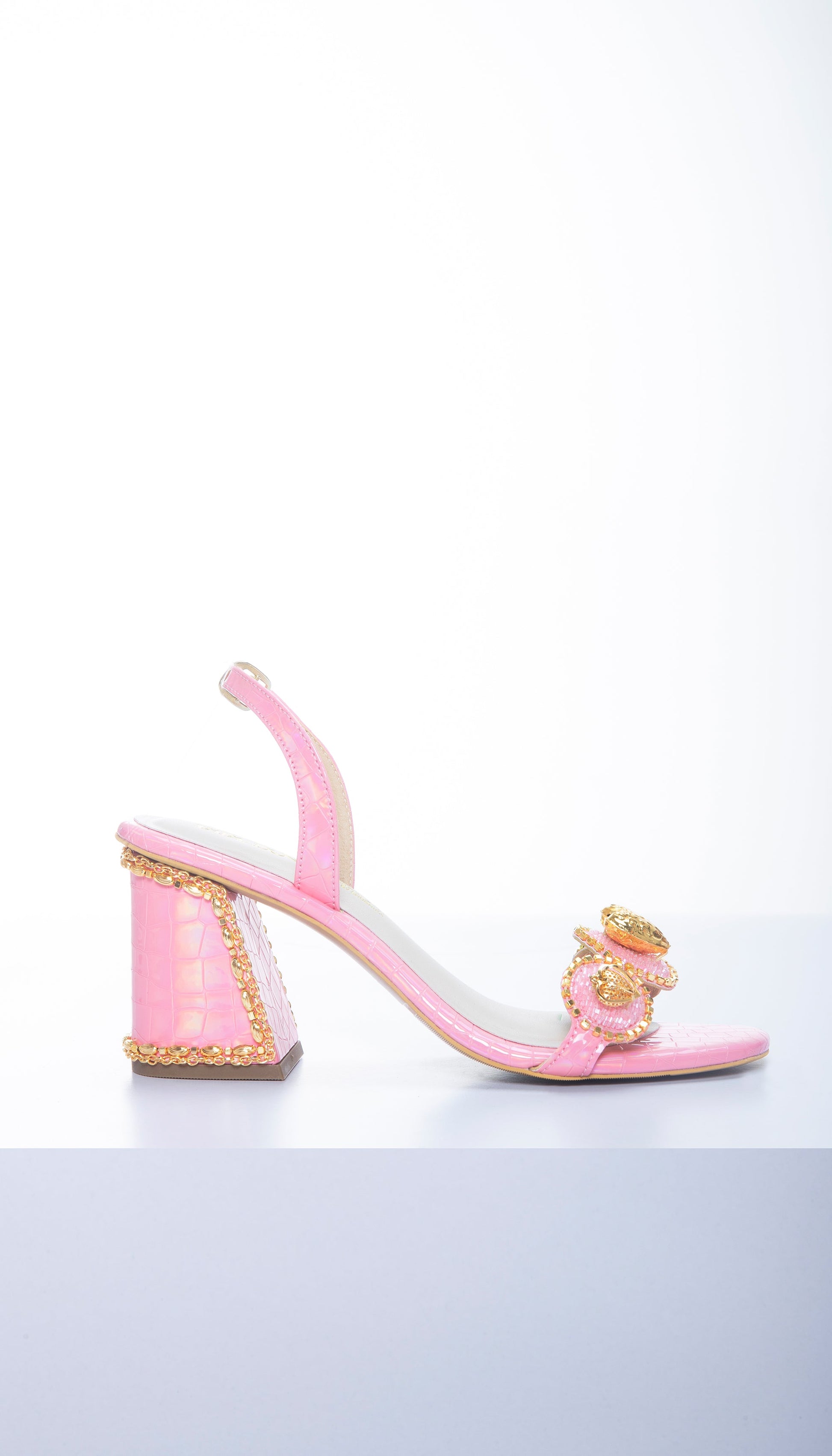 Delicious like a French Macaroon, these dainty block heels, constructed in a holographic vegan leather, feature a strap made of circular treats, hand embellished with glass-cut beads and 3D gold metal hearts.