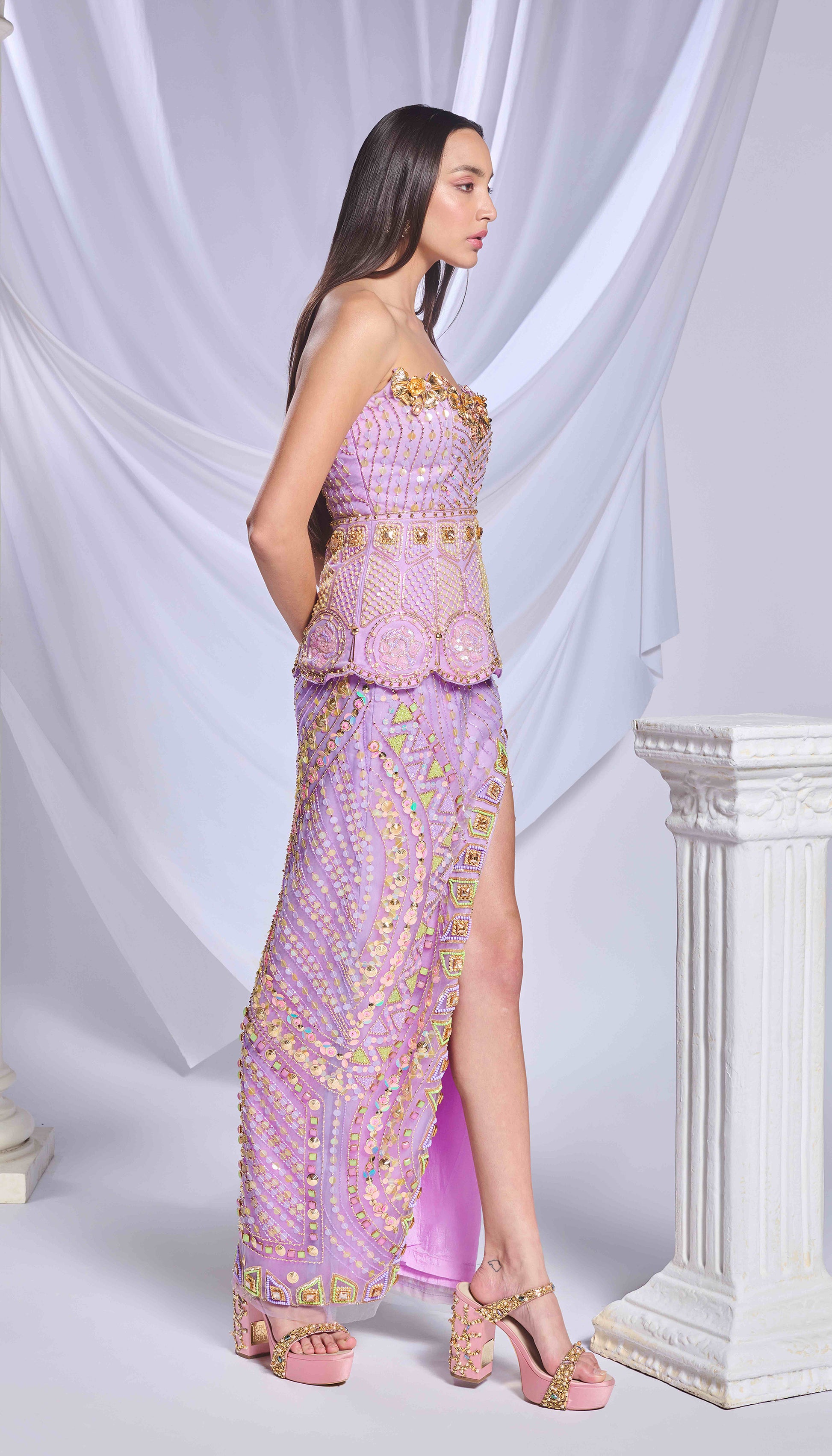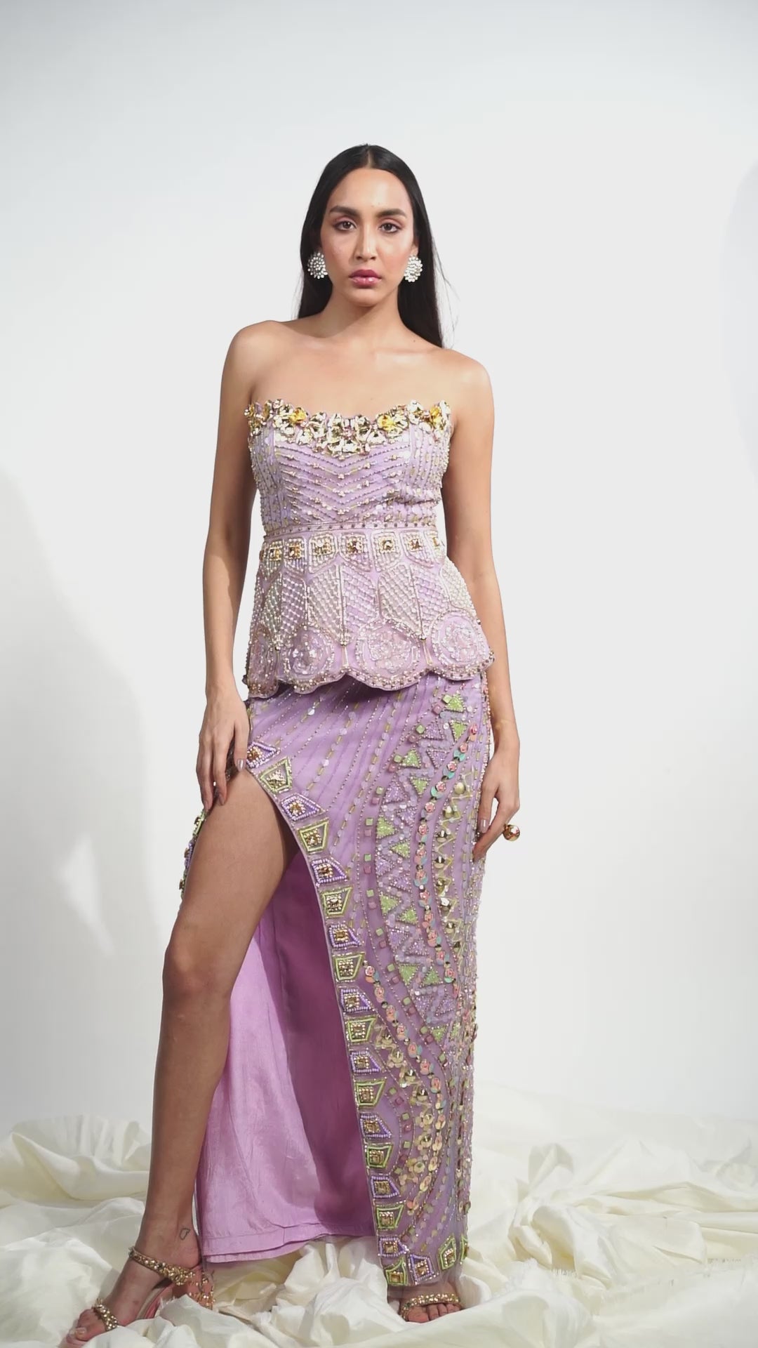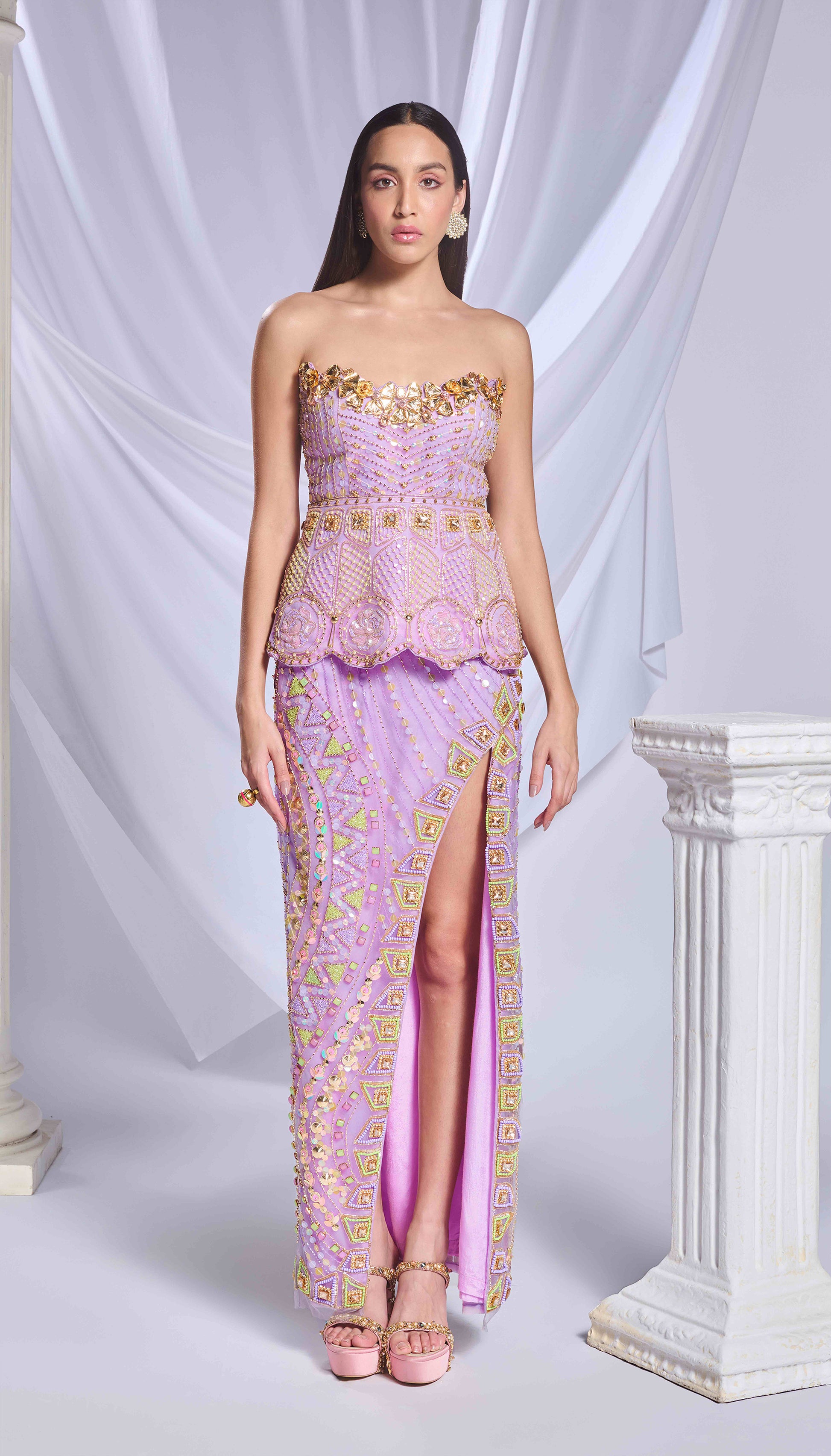 Lilac tulle skirt featuring intricate embroidery with sequins, glass cut beads, metal accents and pearls, accentuated with a slit. Paired with a lilac tulle tube peplum blouse embellished with crystals. .