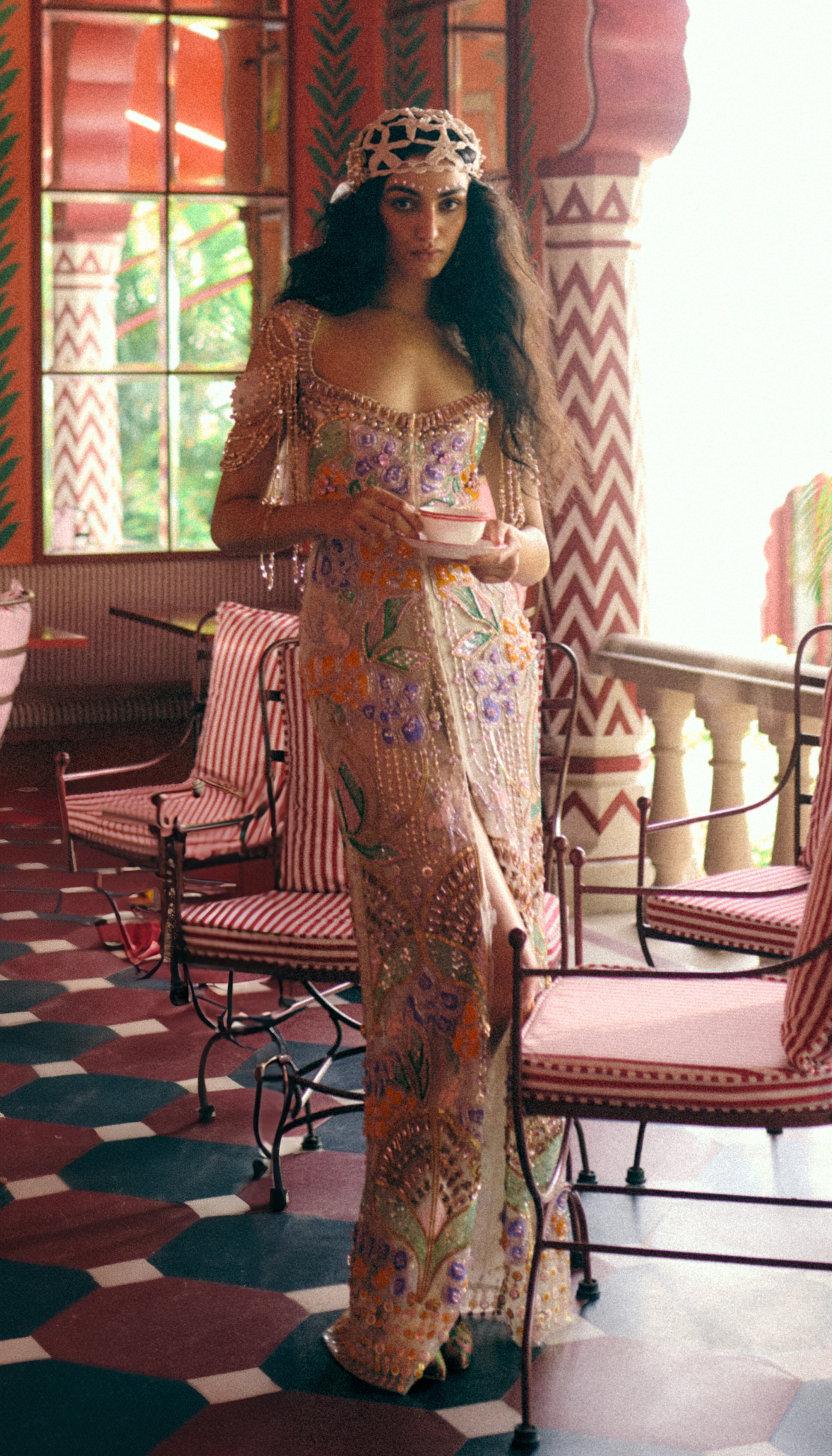 Slim fitted silhouette, symmetric floral embroidery, deep neckline.