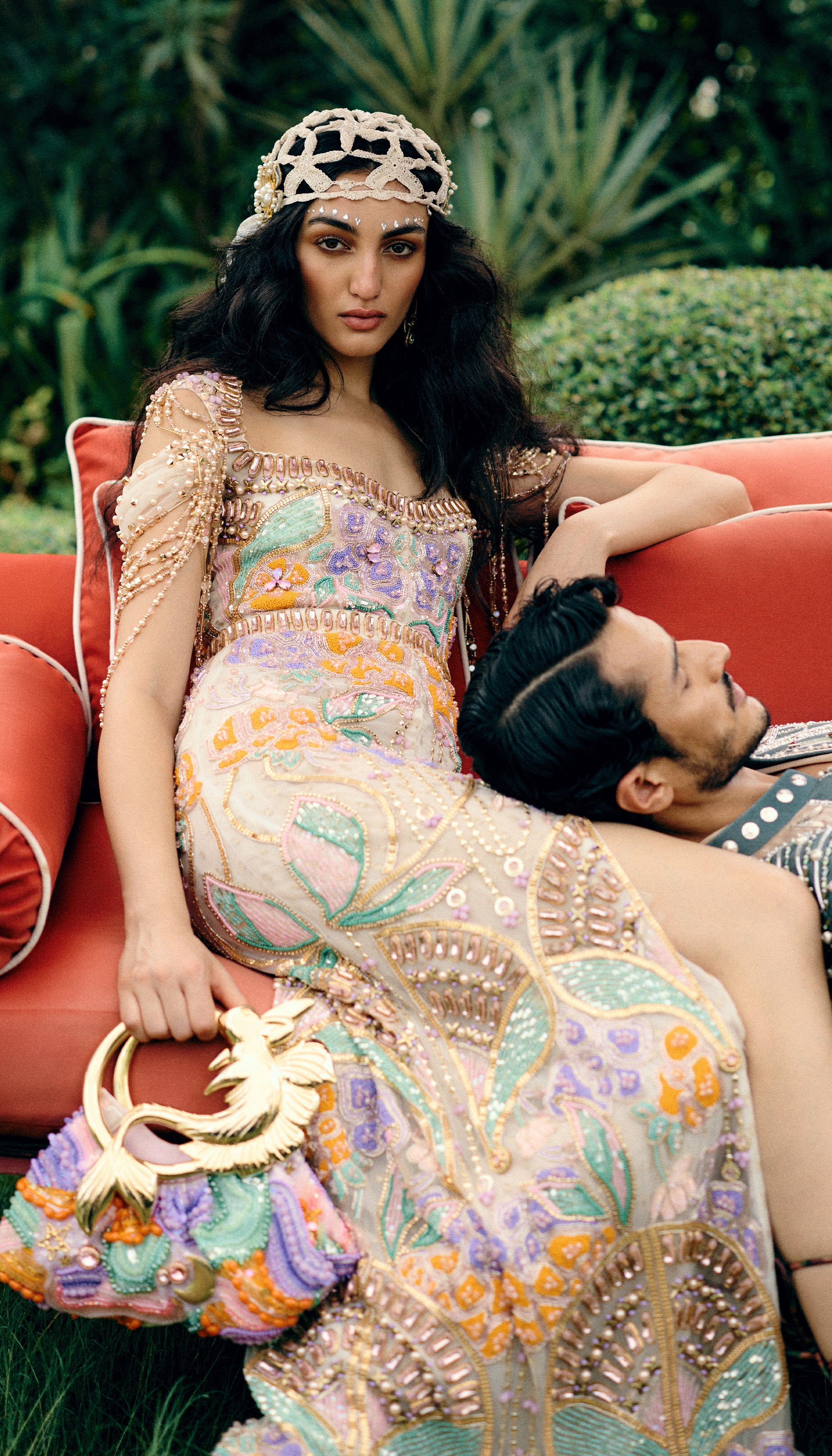 Embellished gown featuring intricate floral beadwork in shades of lilac, orange, and mint, highlighted with sequins and crystal detailing. The fitted silhouette with a front slit and sculpted neckline adds a contemporary edge to this delicate, handcrafted piece.