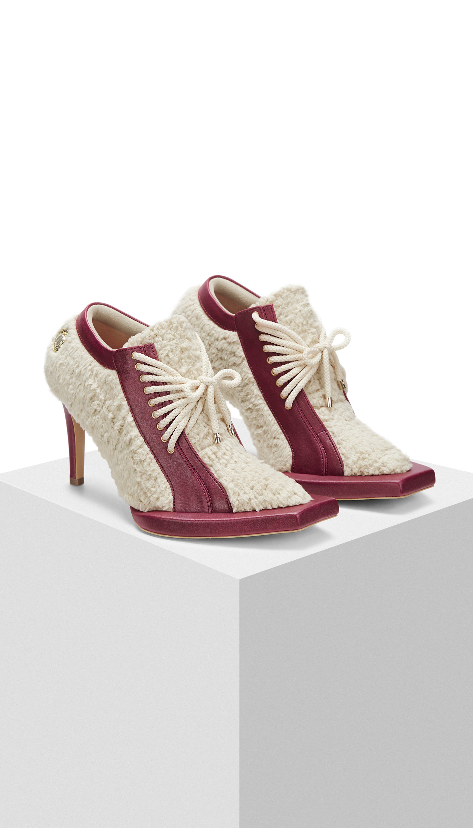 These Stiletto Sneakers are covered in faux fleece resembling cat-fur! The exaggerated square-toe sole gives it a bold, chunky look. Finished with Rosewood Burgundy toned laces and a gold plated Garfield button, they're not for sneaking in—they're for standing out!.