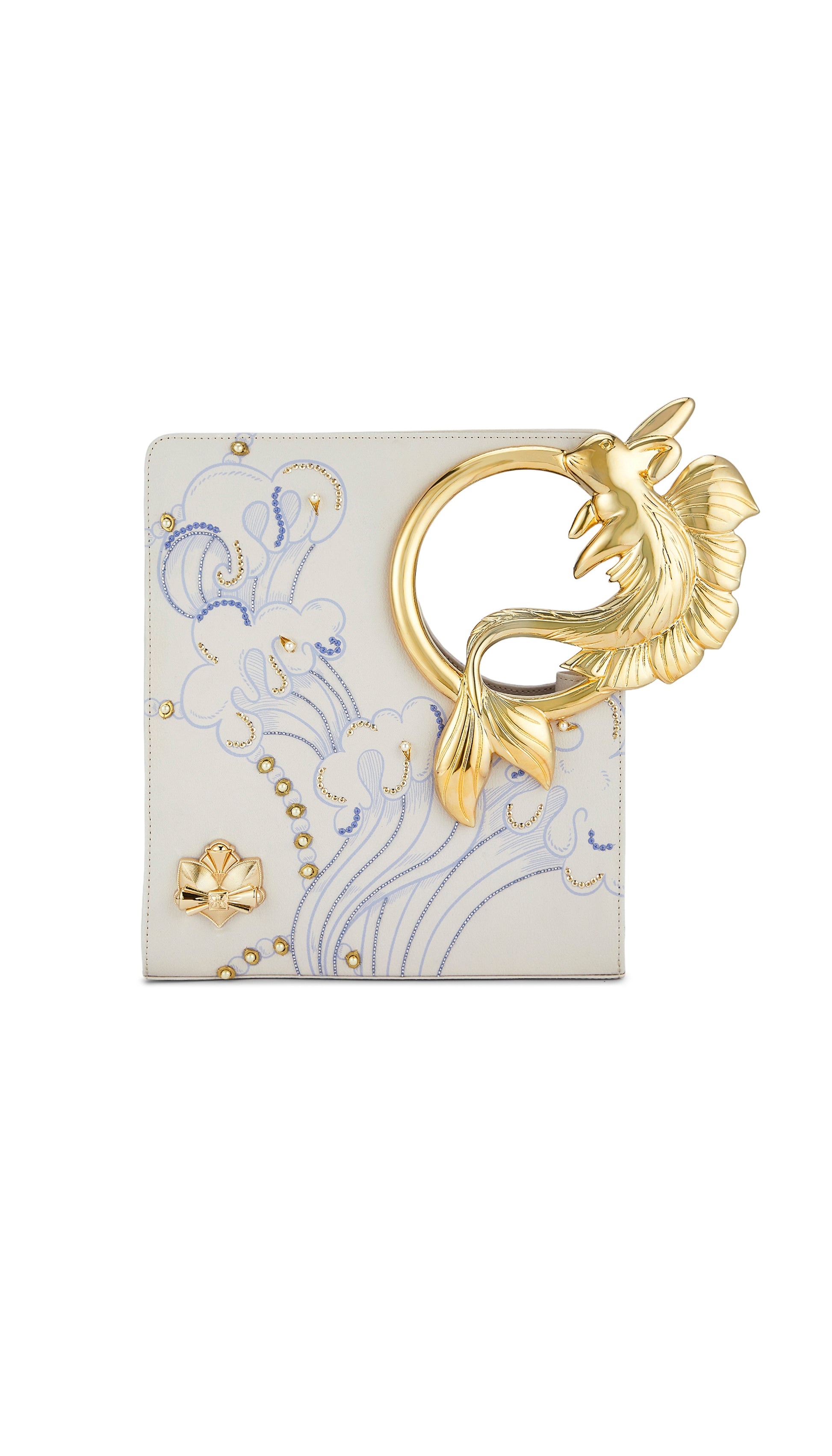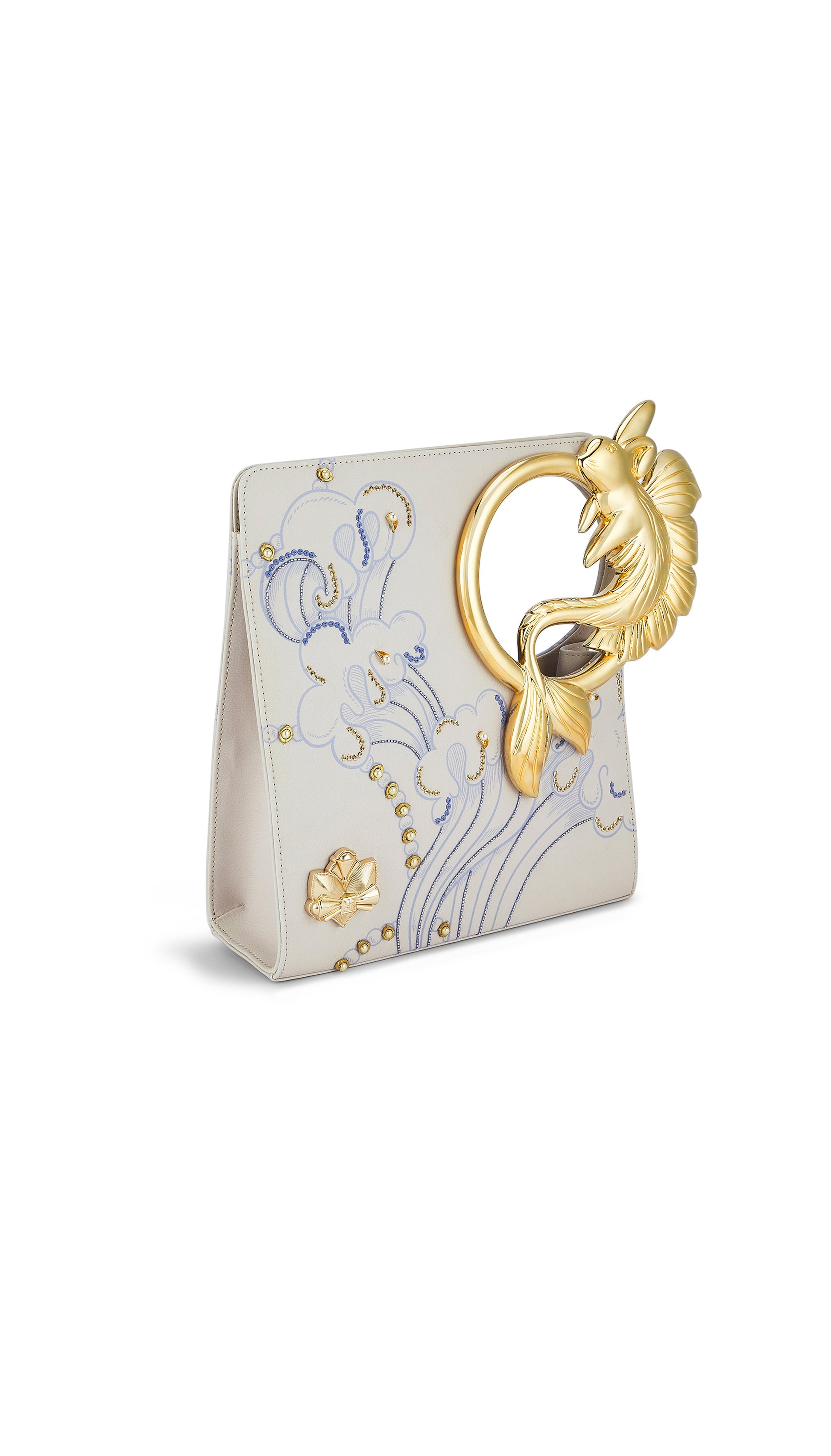 A structured silhouette shaped like a memory of the shore, steady in form yet softened by its details. Across its surface, pearl embellishments glisten like droplets, capturing the moment when waves dissolve into lace at the water’s edge. There is a hush to it — the quiet rhythm of seafoam as it blooms and disappears, leaving behind only shimmer and trace.