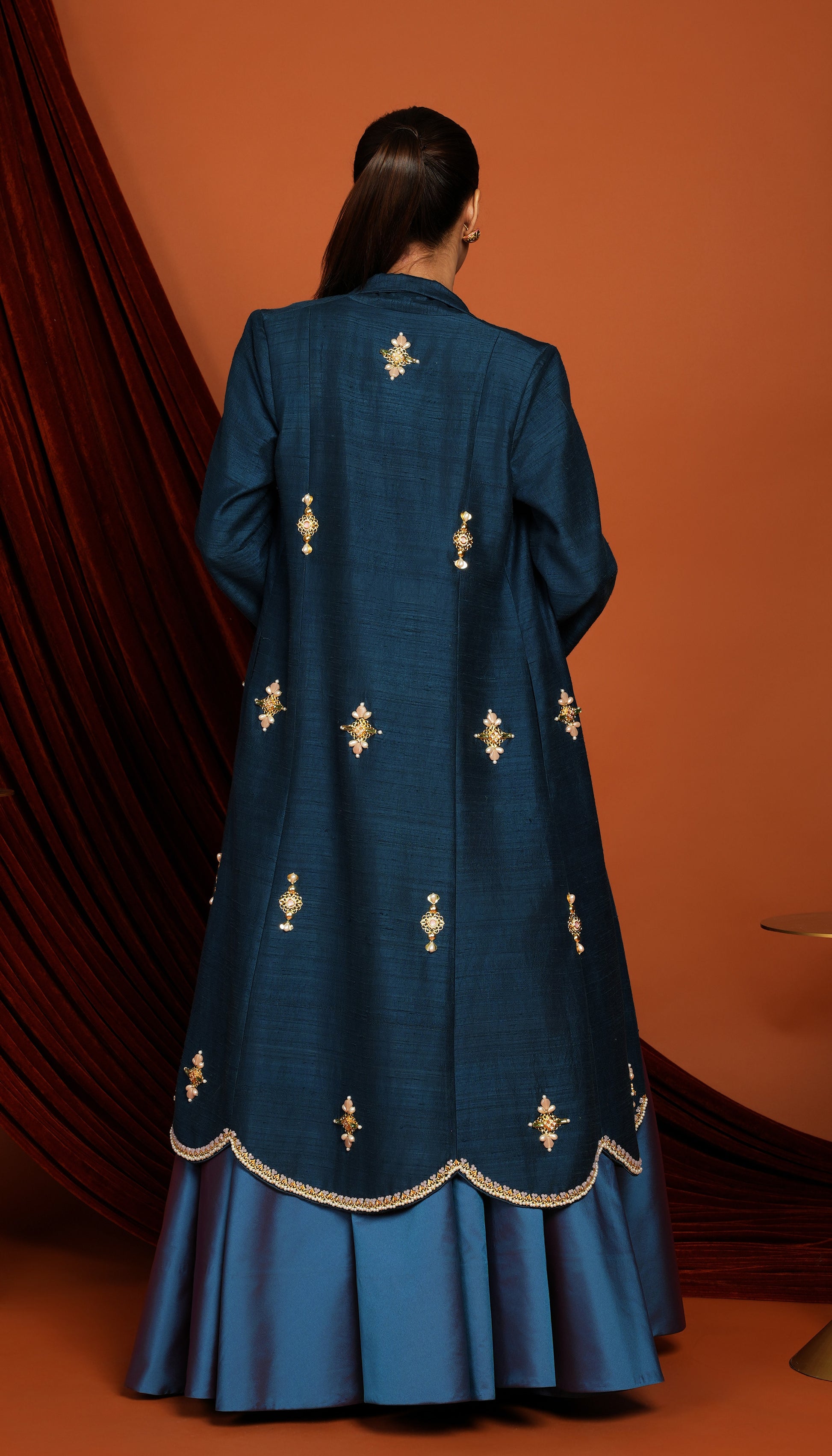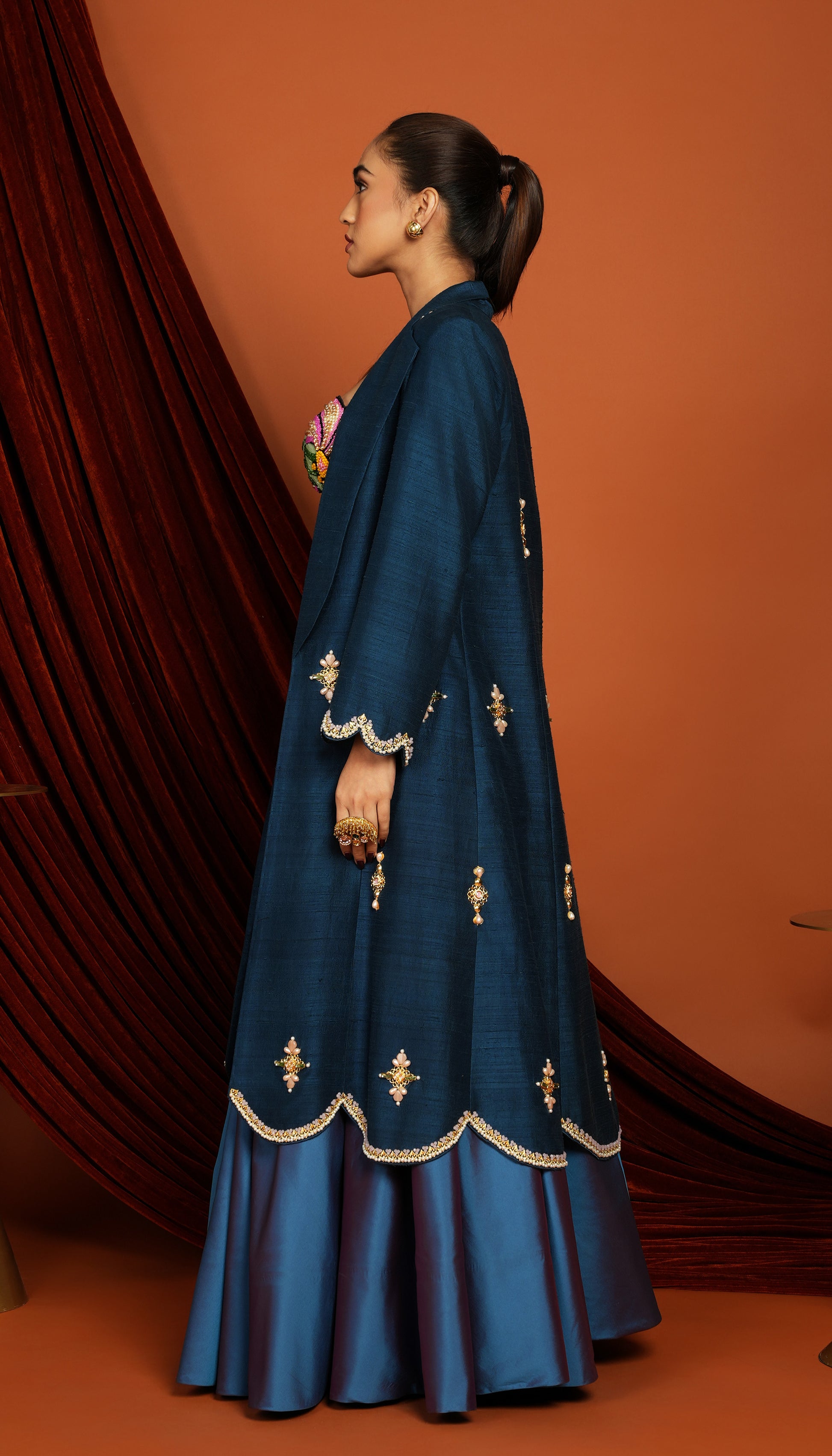 "Monroe - Our blue raw silk jacket featuring embroidered motifs with metallic accents and crystals, lapel collar and scalloped hem adorned with embroidery.