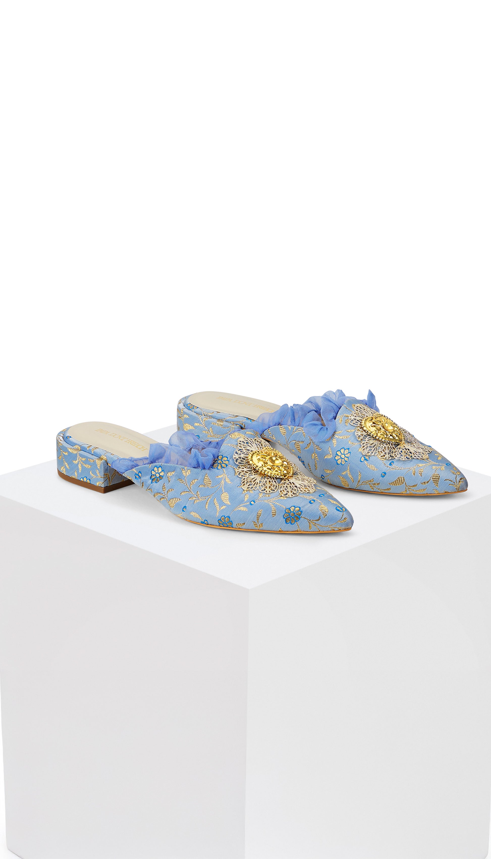 Moonlit Crown reimagines the mule as a jewel for your feet. Crafted in powder blue and crowned with 24K gold-plated textured petals, its center gleams with our signature heart motif, all topped with a whisper of organza frill. A versatile yet decadent statement, it’s designed to rule every function with celestial grace.