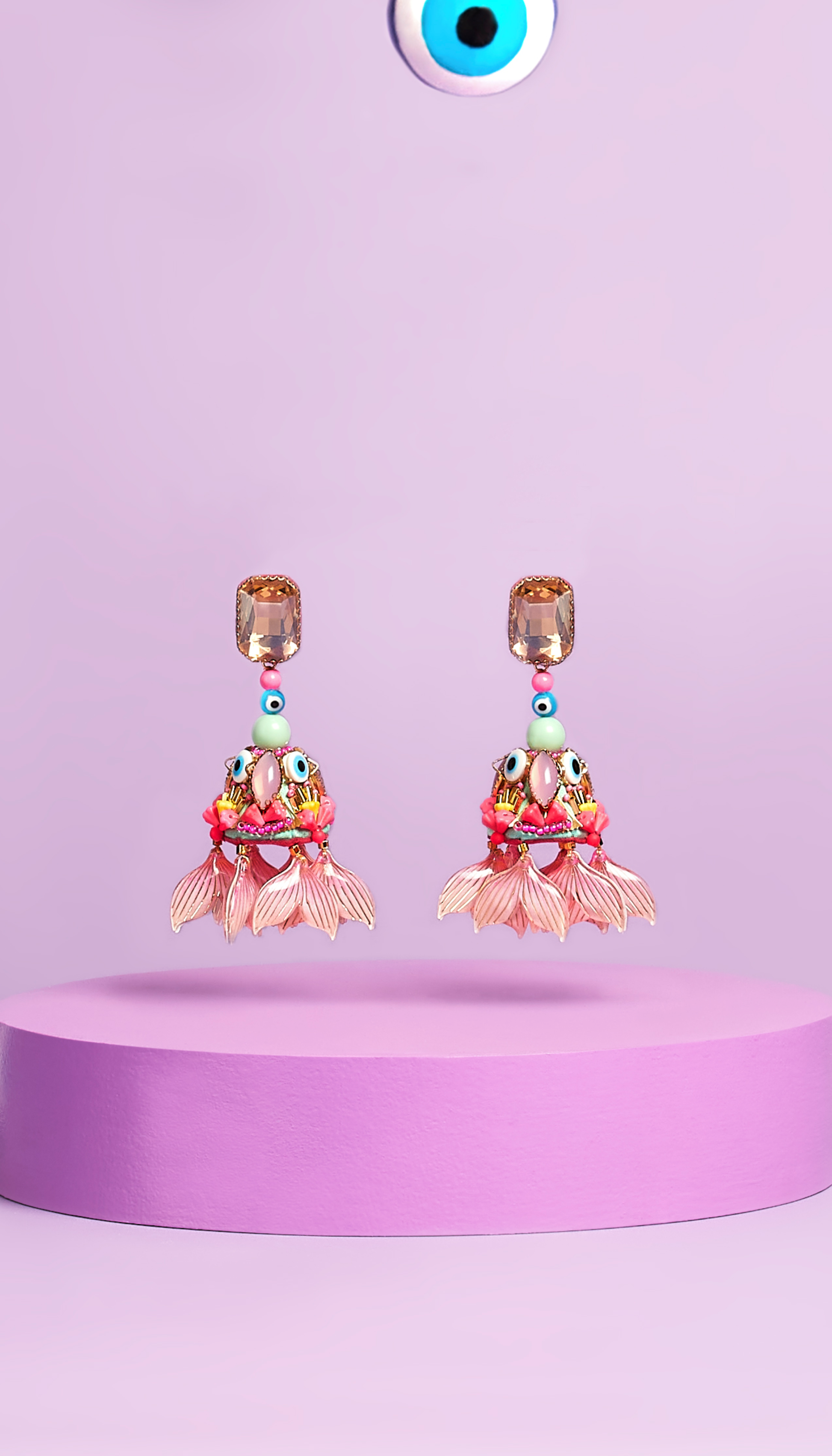 Mr. OMG is here to save you from nazar. A hand-cut hydro champagne stone top with embroidered jhumka finished with delicate pink hangings and evil eye motifs.