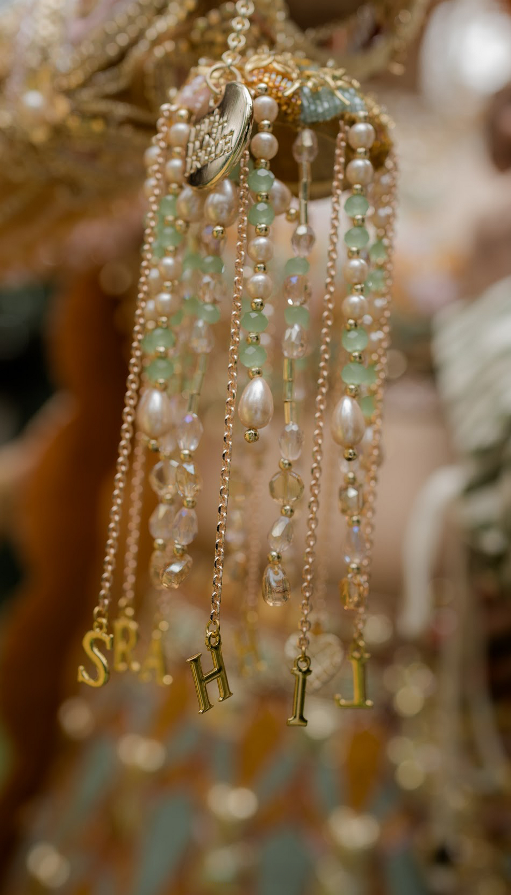 A personalised bridal kaleera in rust, pink, and mint, handcrafted with letter latkans bearing the couple’s names. Of Love & Letters captures ancestral romance and modern emotion — a keepsake for love stories meant to be worn under open skies.