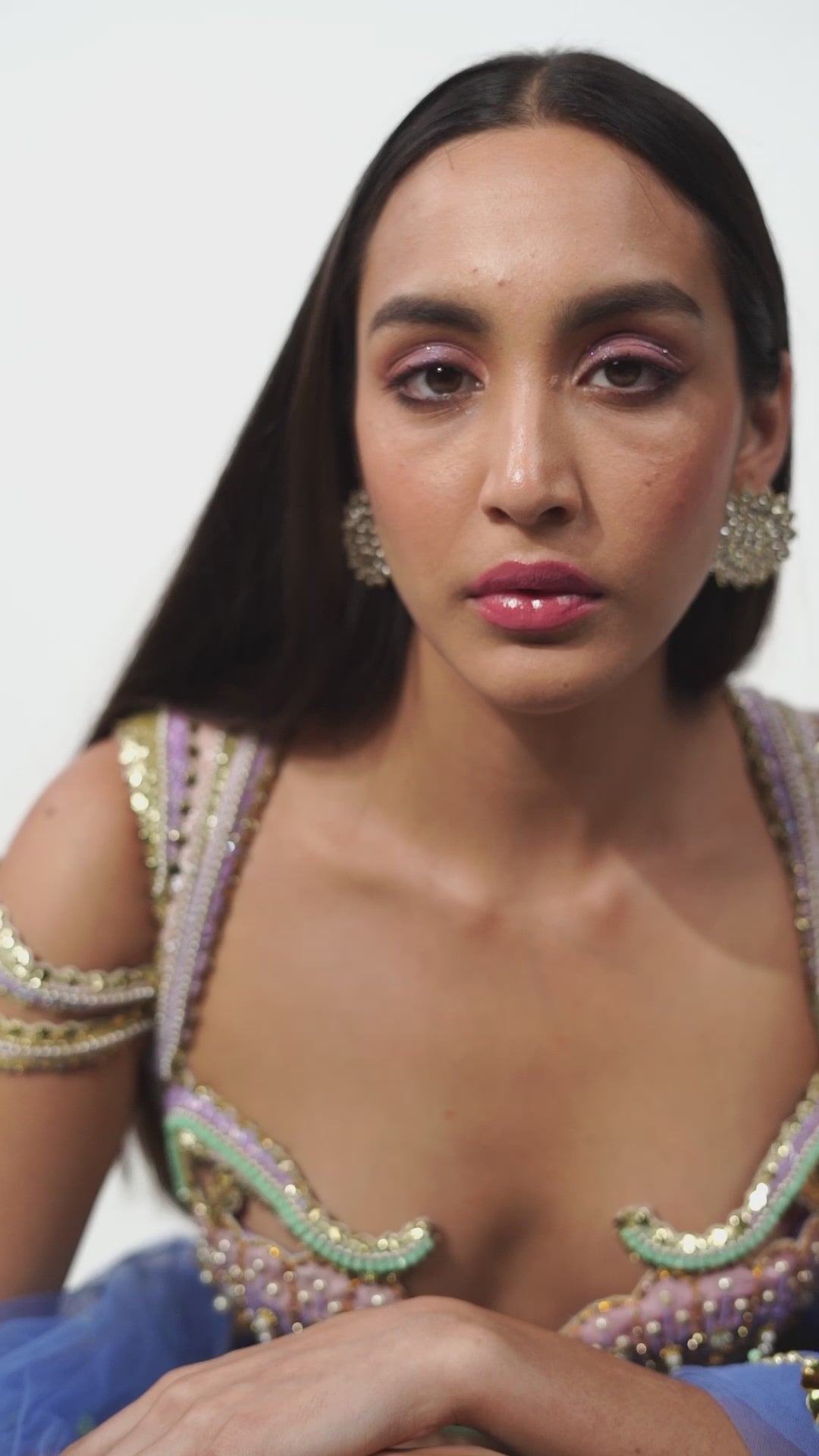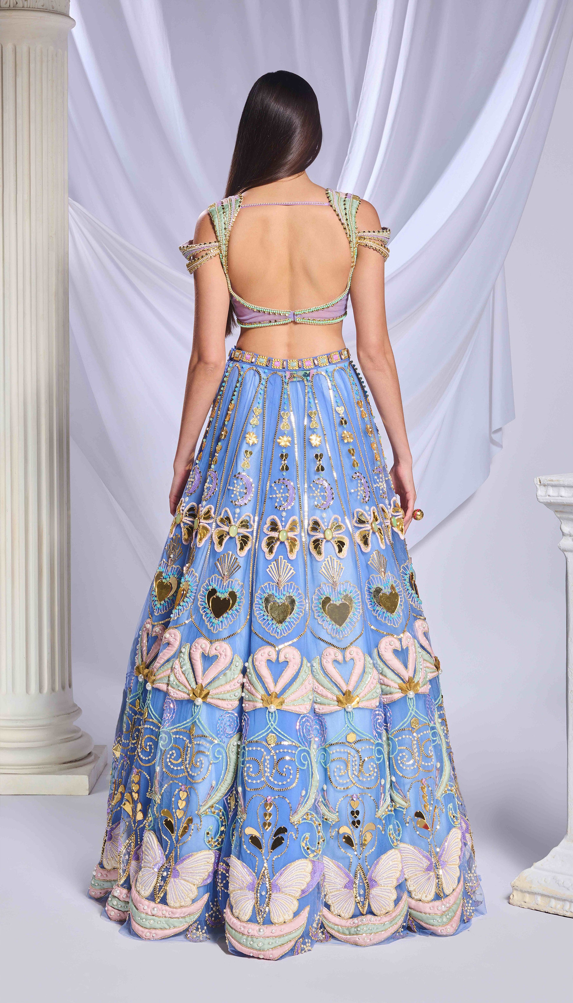 Product InformationAn elegant blue tulle embroidered lehenga adorned with patchwork, special cut acrylics, glass cut beads, pearls, gold chains, sequins and crystals, coupled with a fully embroidered blouse embellished with heart shaped chains, pearls, crystals and glass cut beads. This ensemble is complemented by a matching blue tulle dupatta with an acrylic border and scatters all over for a sophisticated look.