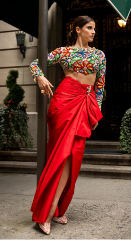 The showstopper of this collection, a tulle full sleeve top with structured shoulders and a contoured hem, embellished with colourful crystals, beads, sequins and drop pearls. Paired with our signature draped red taffeta skirt highlighted with crystals.