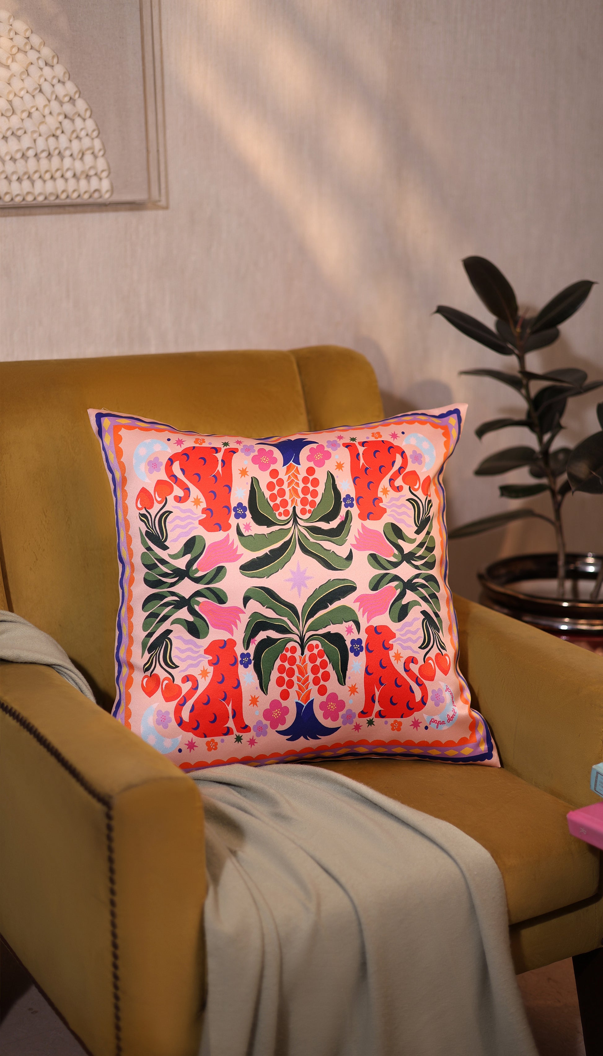 This satin cushion cover bursts with color and charm, showcasing a striking symmetrical design of fiery red leopards, lush tropical leaves, and blooming pink-orange florals on a peach base. Playful moons, hearts, and stars dance through the pattern, all framed by bold, vibrant borders. Finished with a discreet zipper at the back
