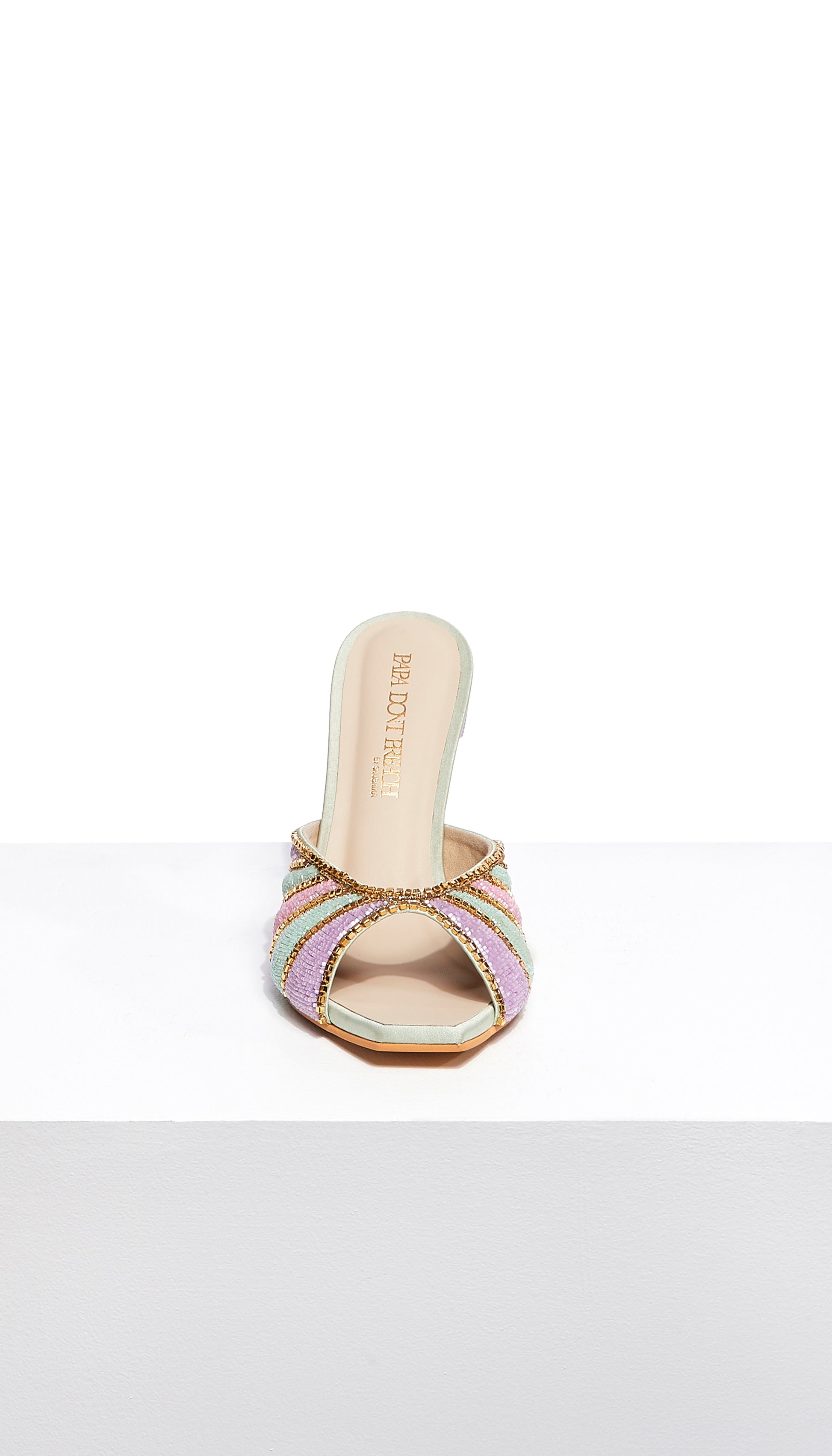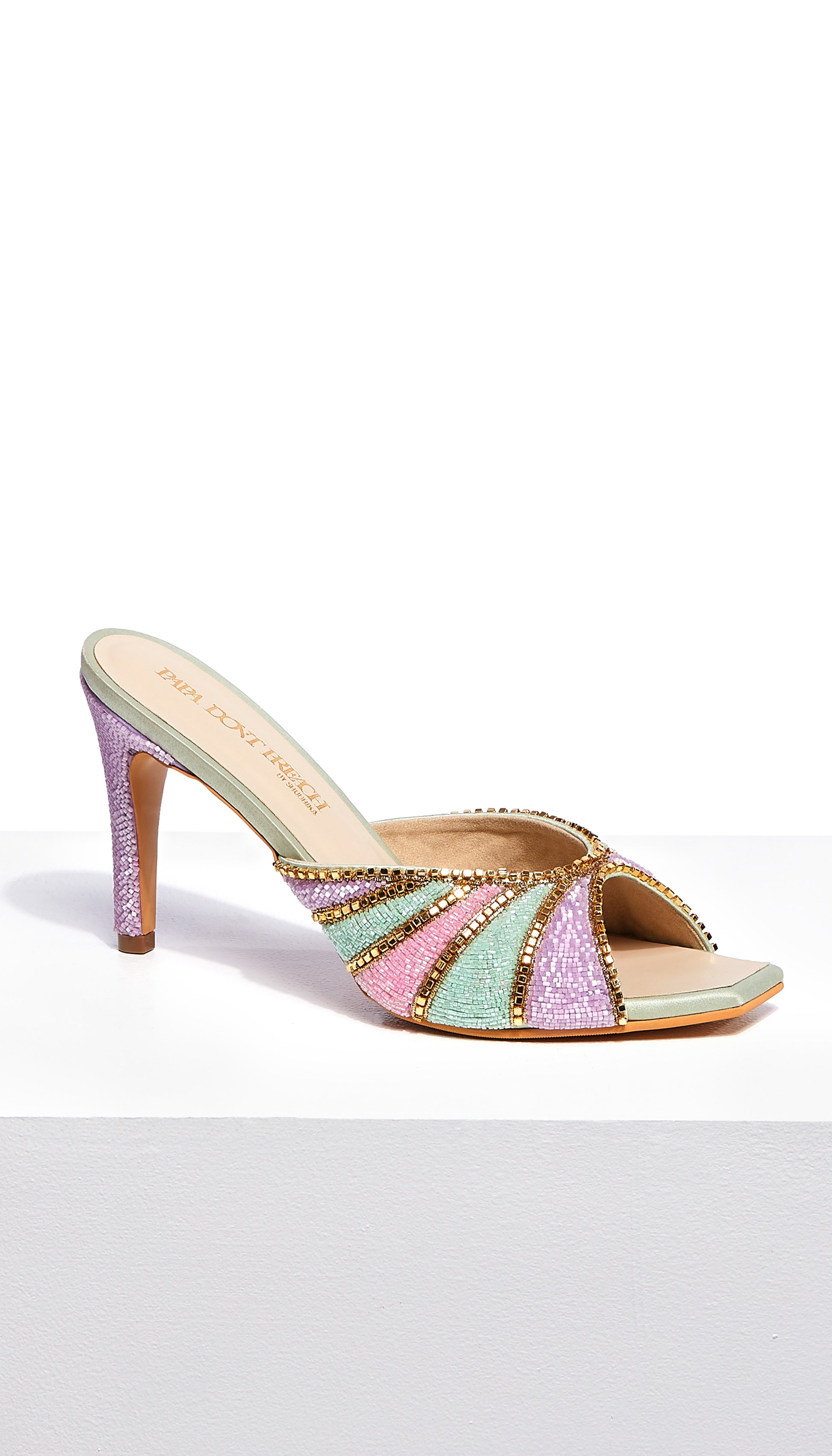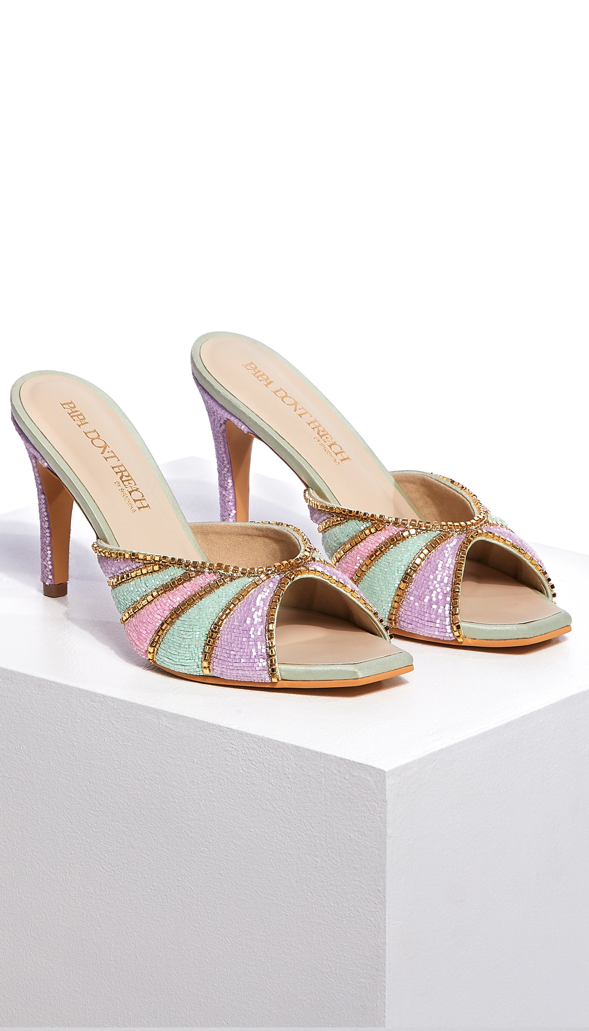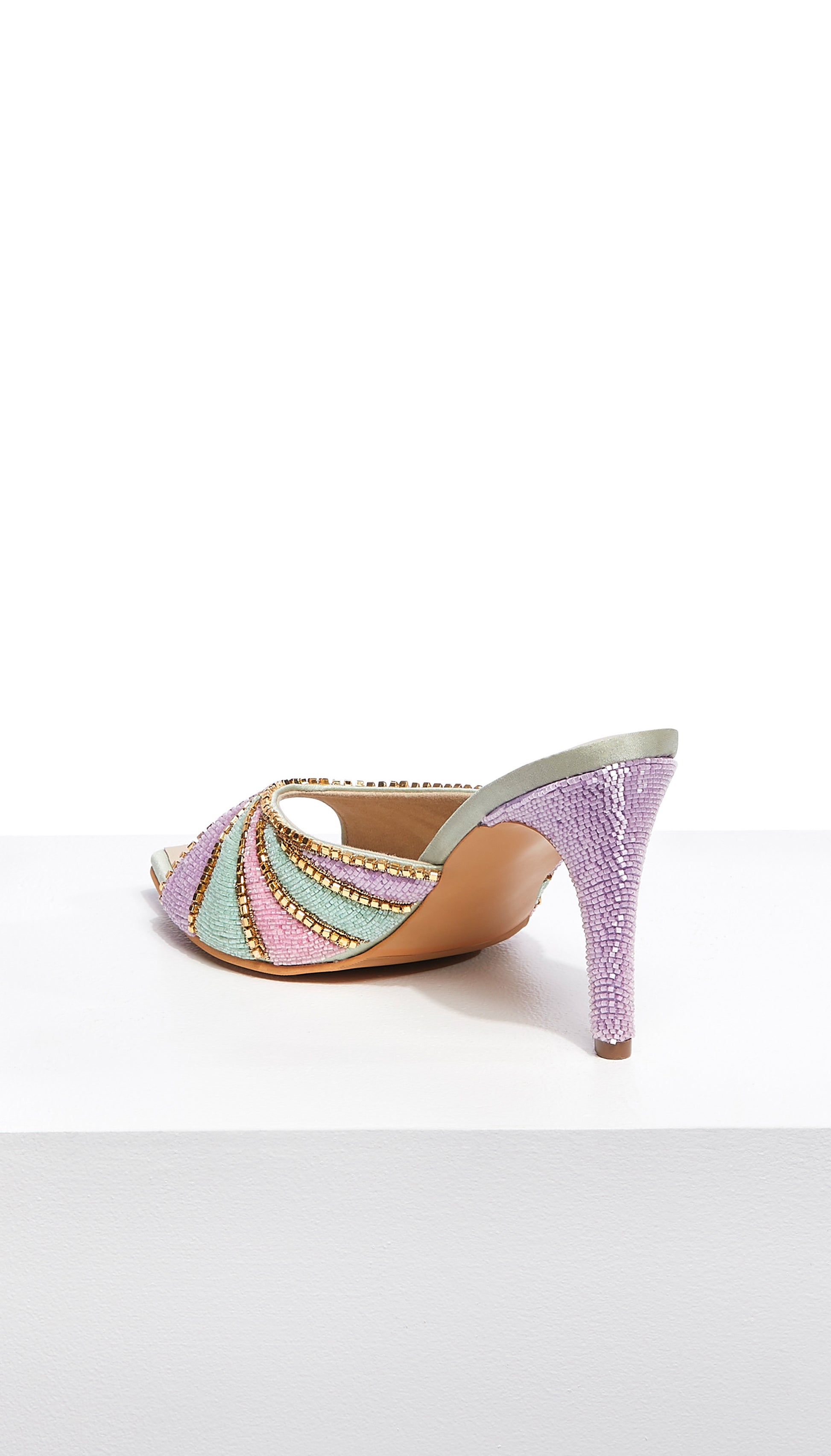 Chic, versatile & comfortable, these open square-toe mules are handcrafted in a soft mint satin on a 3.5inch stiletto heel. She is completely embellished in soft pastel glass cut beads.