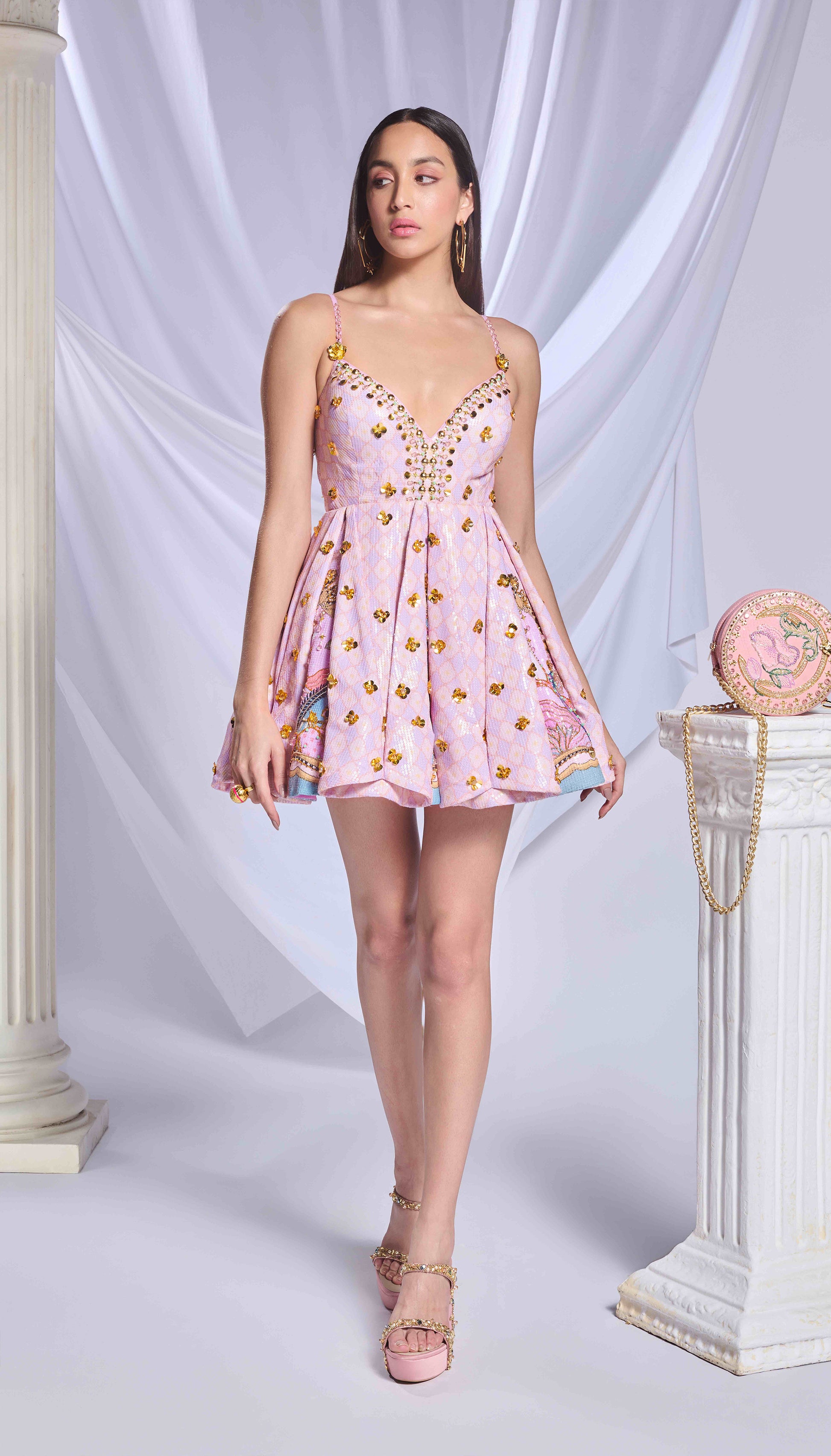 Our signature babydoll dress in peach, crafted with six panels. Each intricately embroidered with sequins, crystals and glass cut beads to narrate a unique story on every panel.