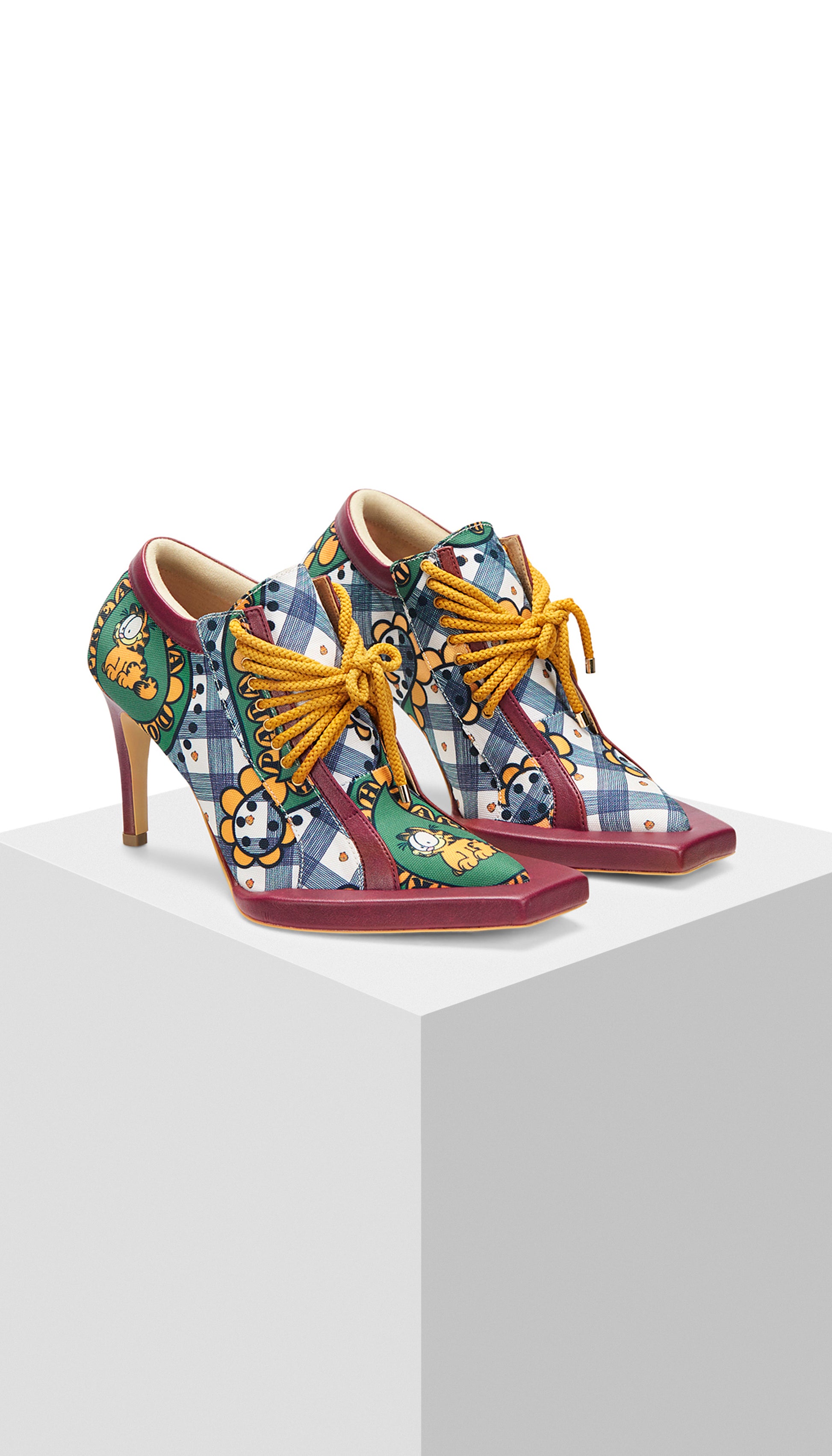 These Stiletto Sneakers come with a criss-cross Garfield print. The exaggerated square-toe sole gives it a bold, chunky look. Finished with Garfield orange laces and a gold-plated Garfield button, they're not for sneaking in—they're for standing out!