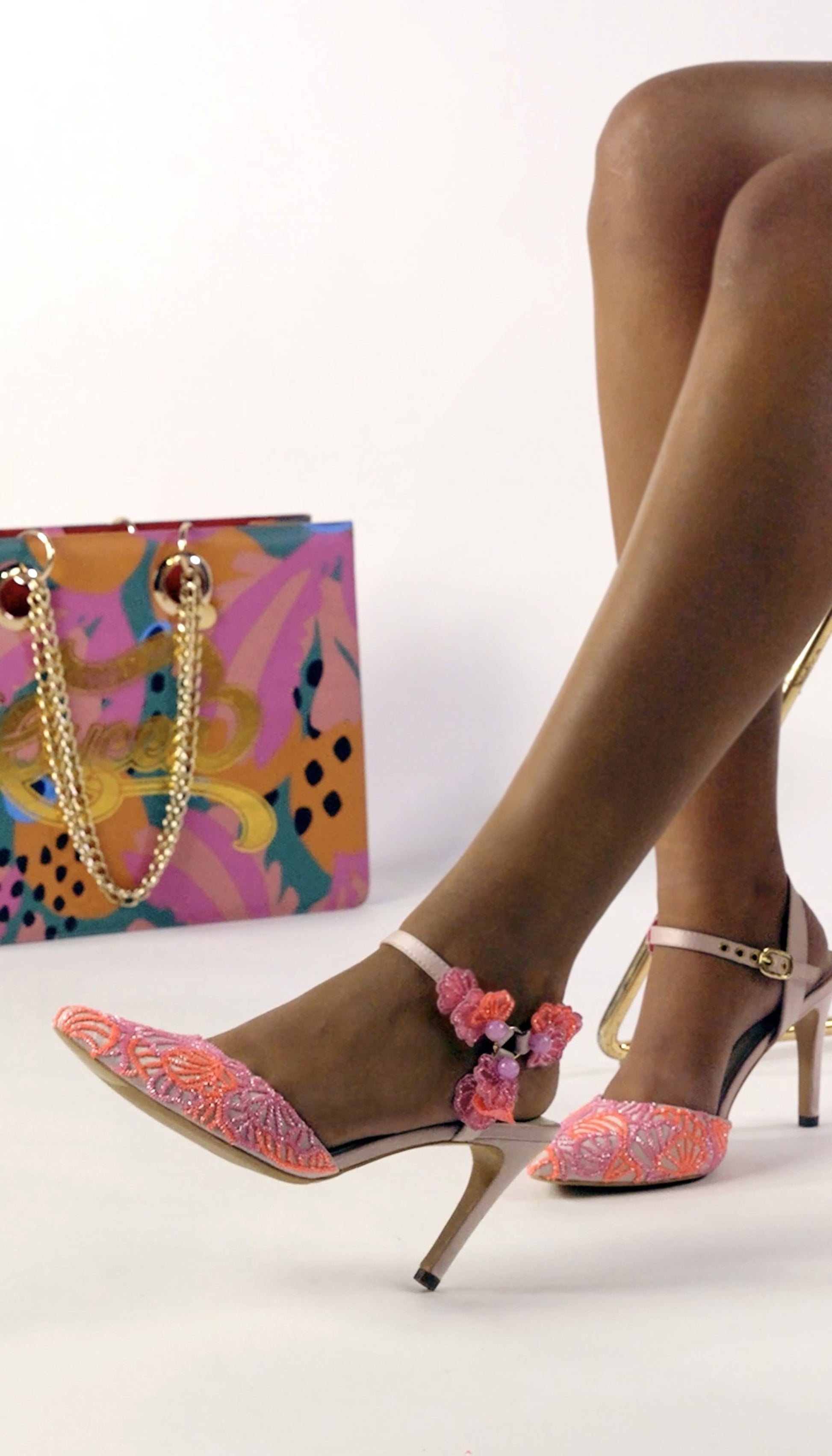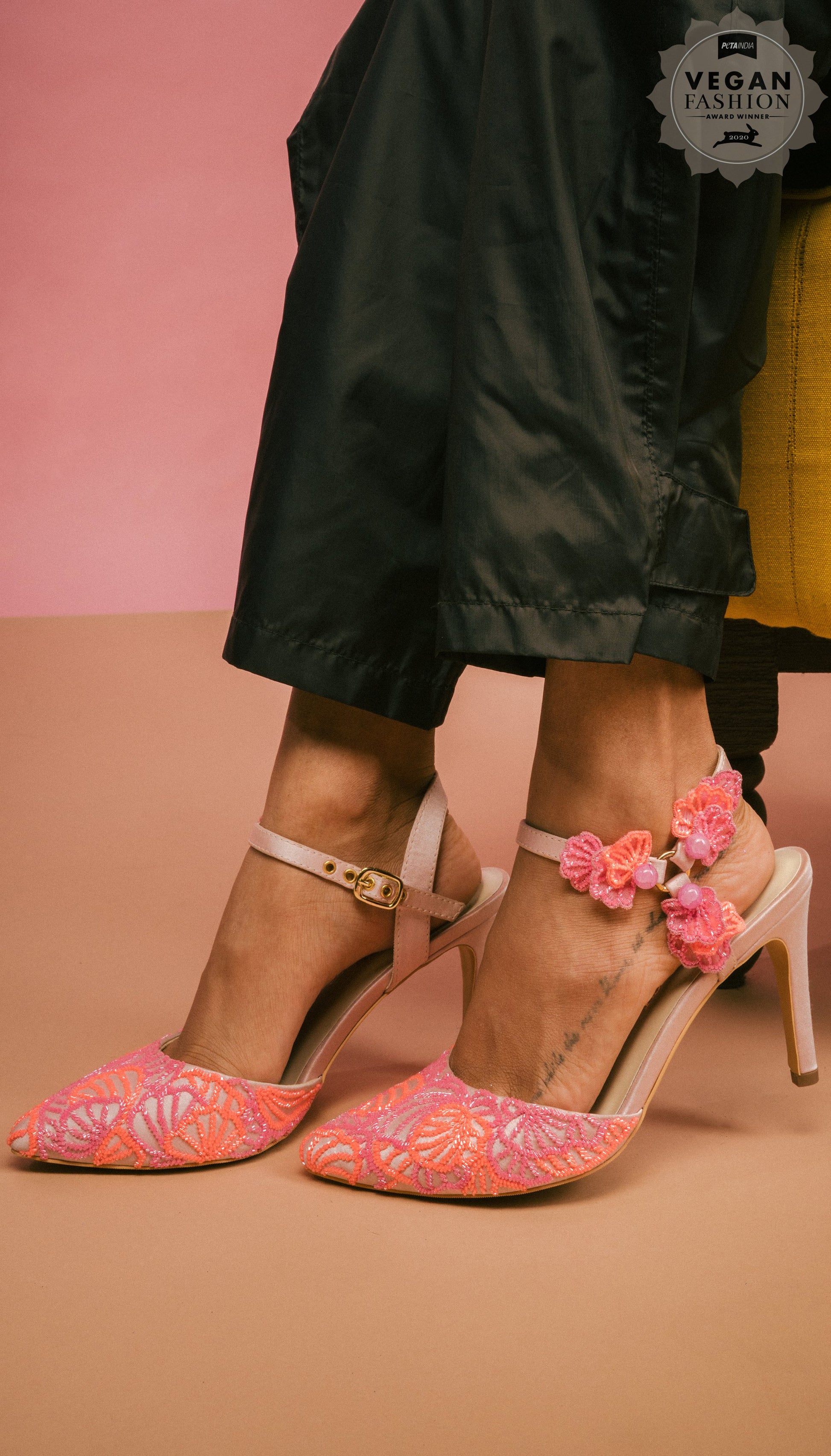 An elegant stiletto, handcrafted in a soft blush satin with a pointed toe and delicate ringlet fastened ankle band, featuring a glassy pearl and 3D organza flower detail to one side. She’s embroidered in a bloom of spring flowers with glass-cut beads of pop neon coral and pinks on a mule cut.