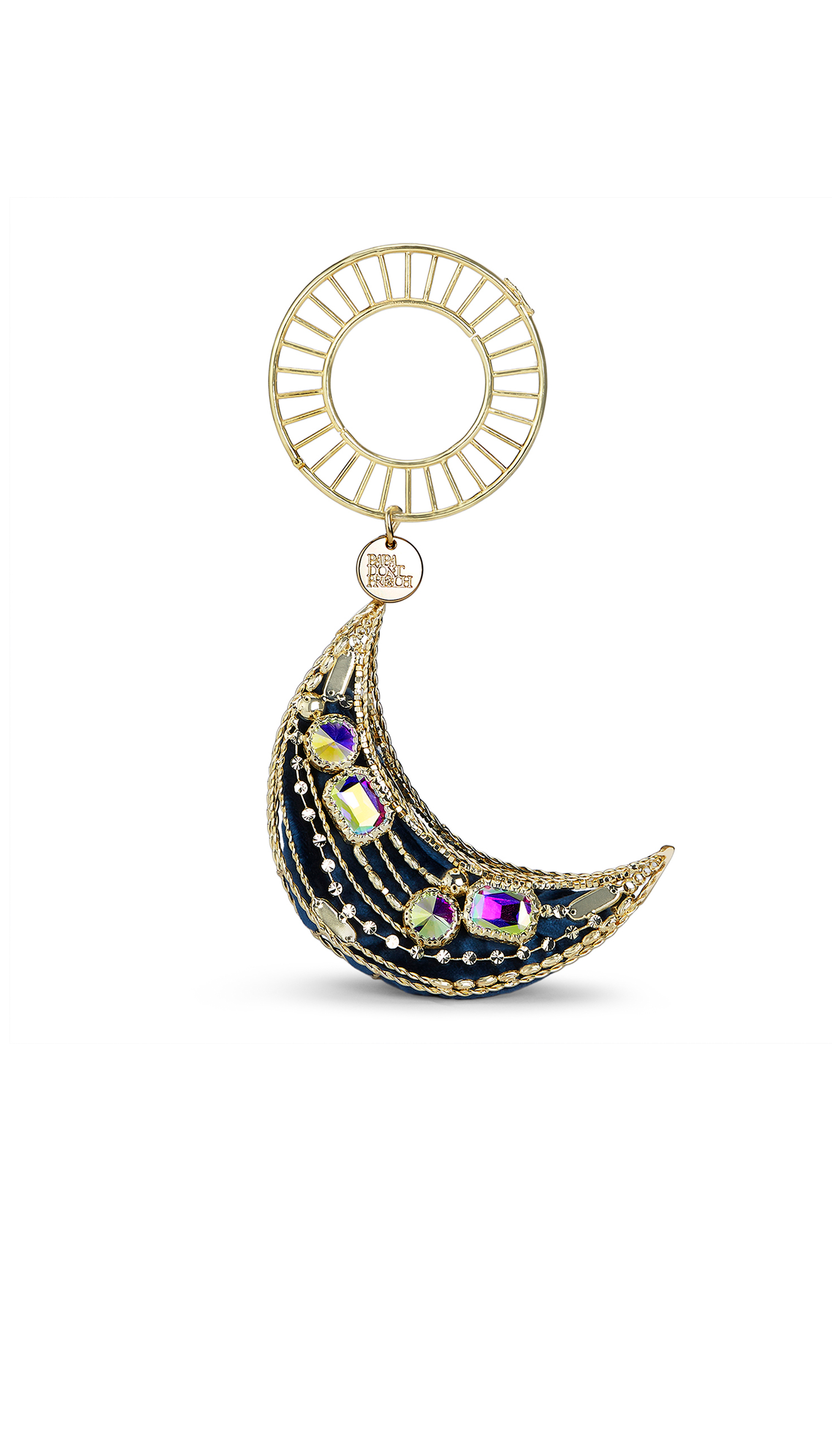 A statement piece is our small extension to the moon bag. This is fully handmade and takes over 48 hours to make. It’s brass based and 24k gold plated. It comes with a blue velvet potli bag inside with a zip closure.