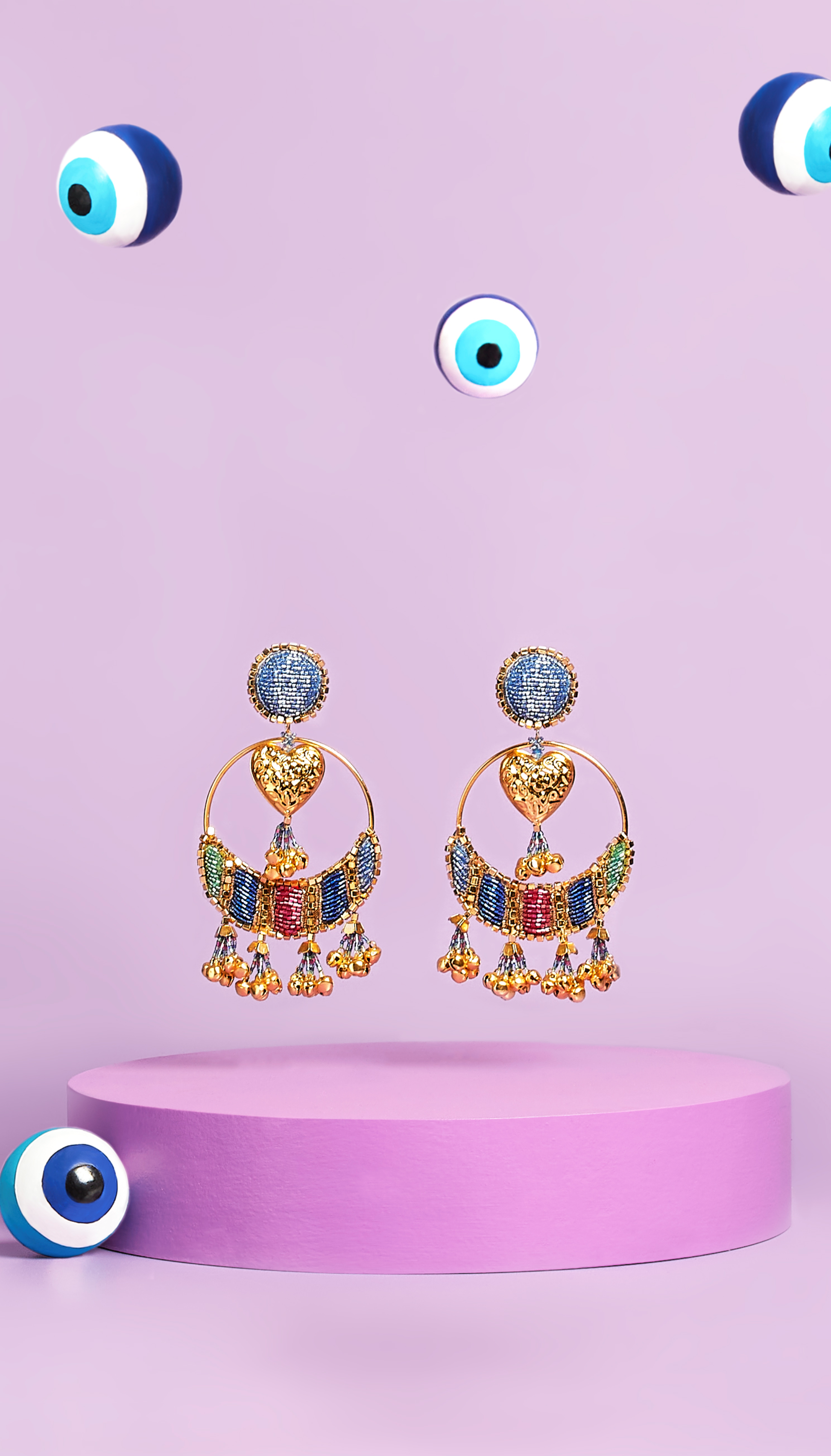 With a color palette inspired by Van Gogh's 'Starry Night', is our version of the traditional earring silhouette chandbali. Exquisitely hand-embroidered with glass beads and ghunghroos, this piece has our heart!