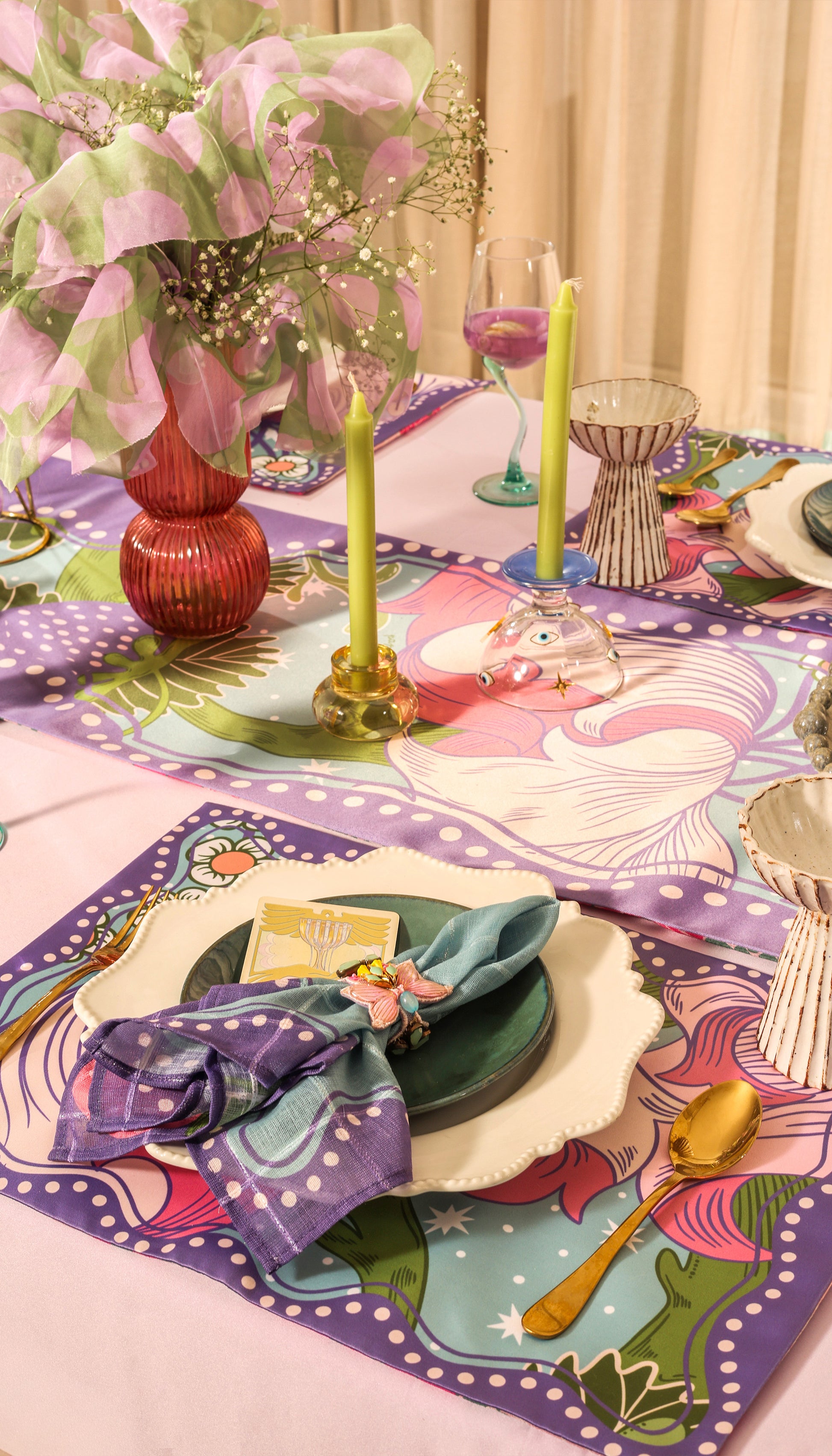 Made in linen checks, offering a premium feel with a soft yet structured drape. Each napkin features original, hand-illustrated corner motifs with playful yet artistic elements — adding visual interest without crowding the table setting.