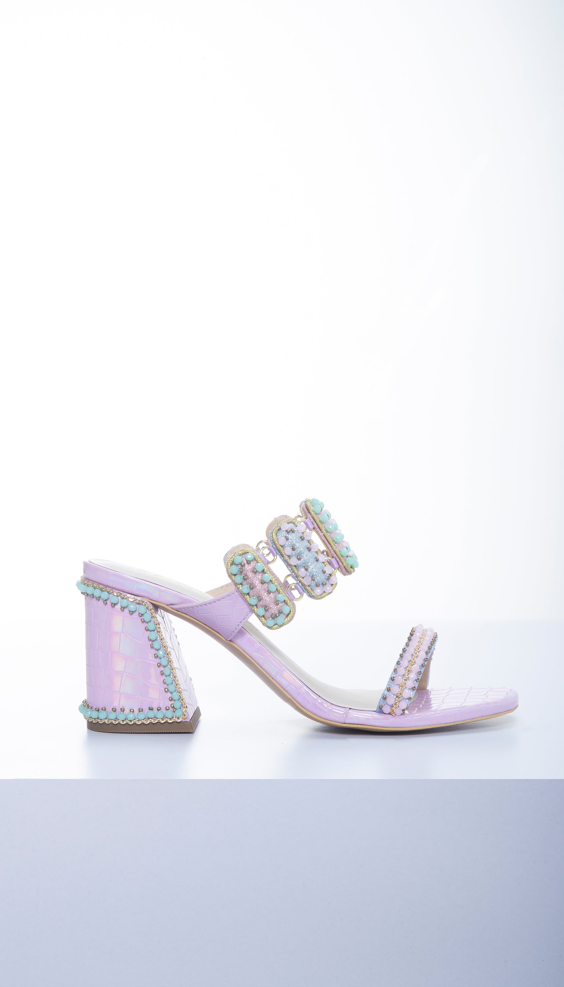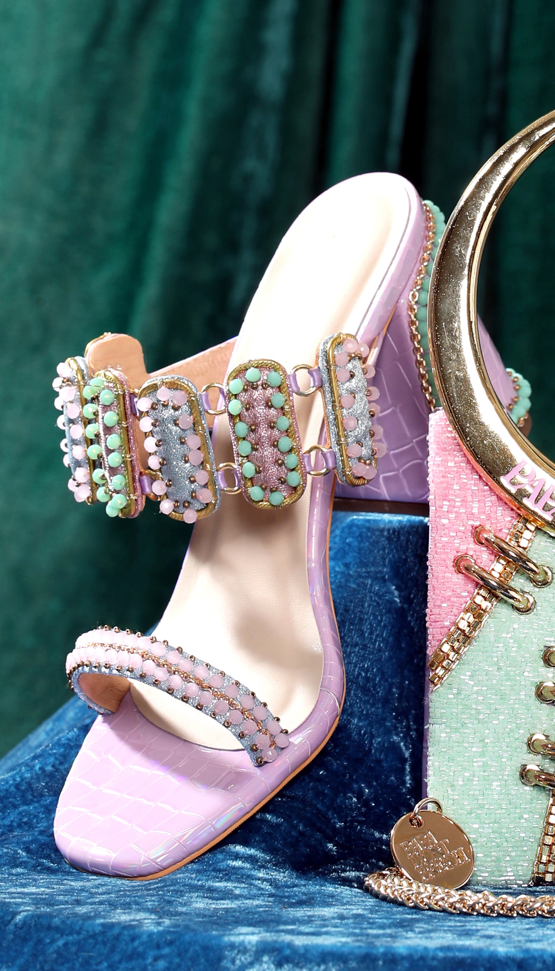 Deconstructed and hand-embellished Lilac block heels, with a delicate open-toe strap, embroidered with chain and bead details. It's instep strap features a ringlet design with mini tabs made in metallic textured Lurex fabric.
