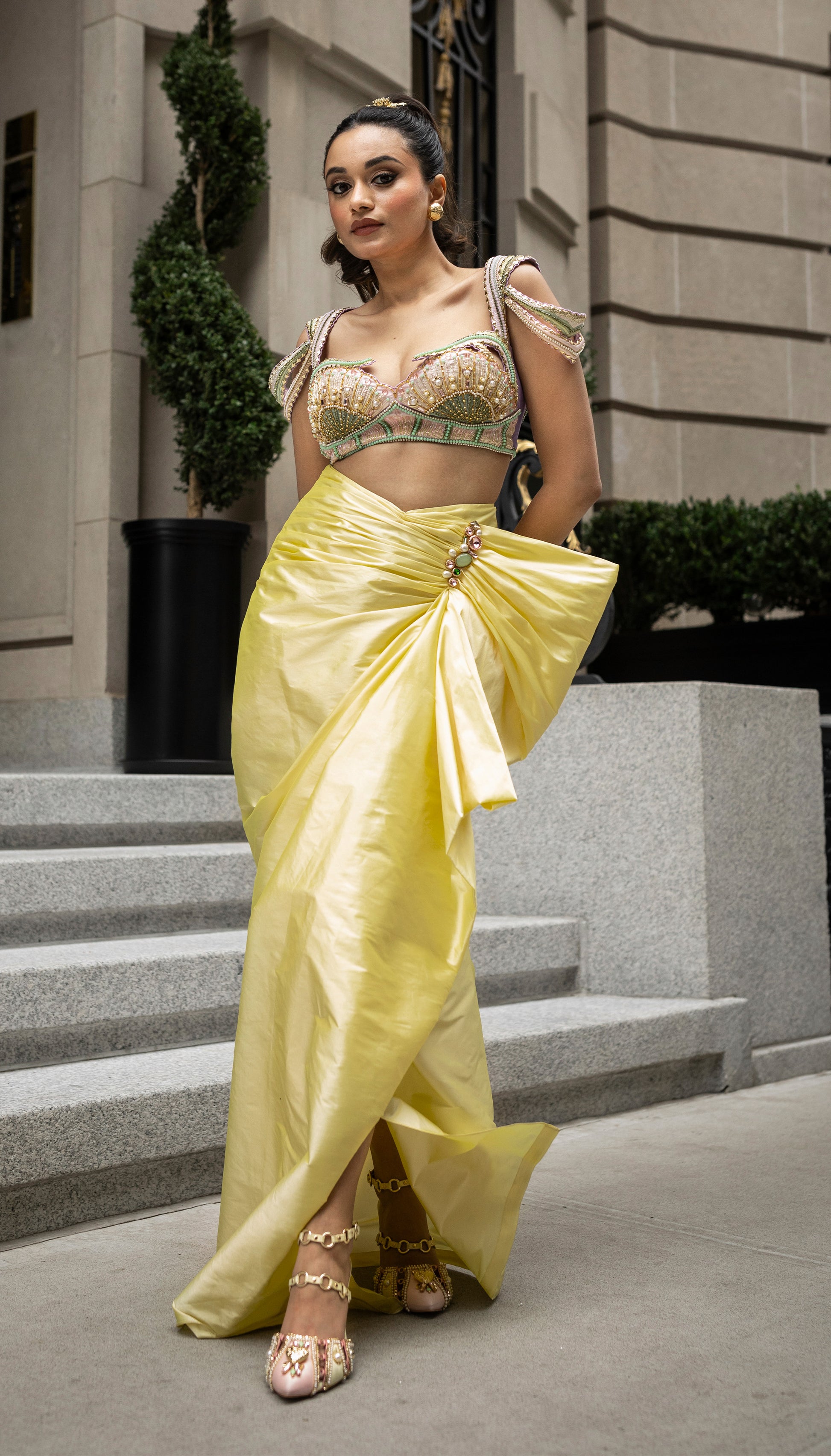 This eye-catching set from the collection, a wave like structured bralette with embroidered shoulder details and embellished with colourful crystals, beads, sequins and drop pearls. Paired with our signature draped butter yellow taffeta skirt highlighted with crystals and stones.