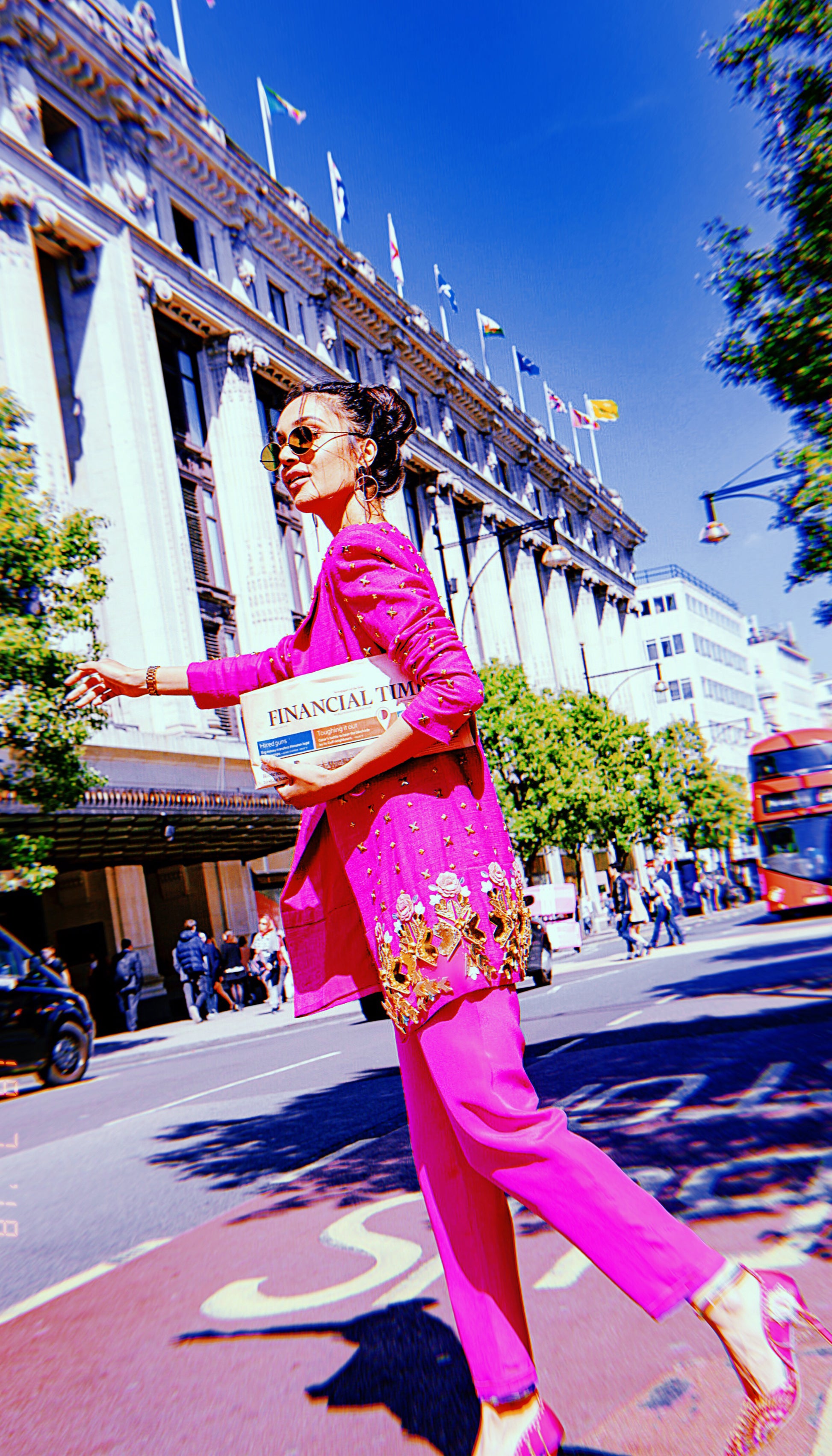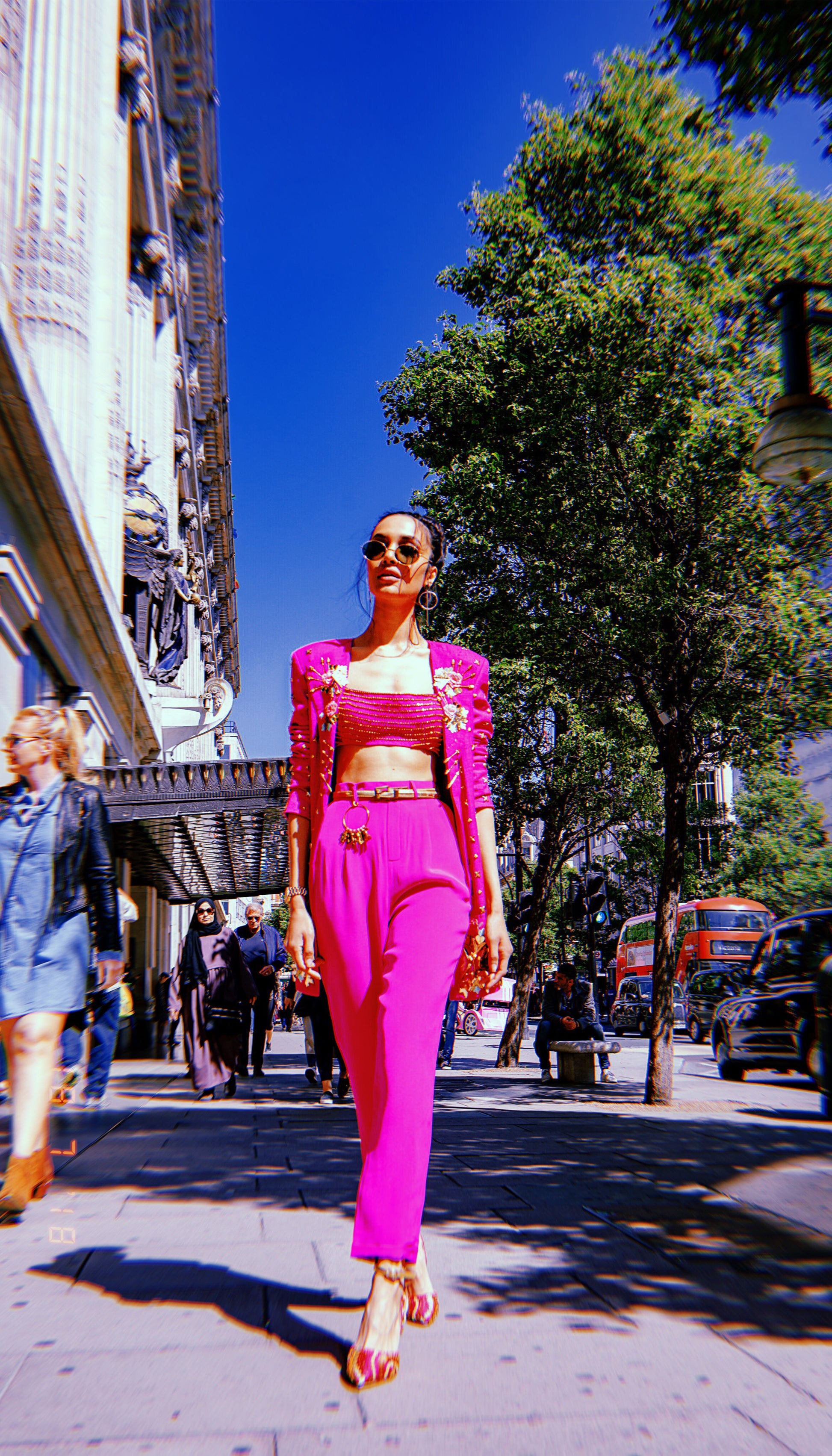 Hot pink golden beaded lines bralette paired with hot pink pants + hot pink metal sequin and rosette embellished blazer