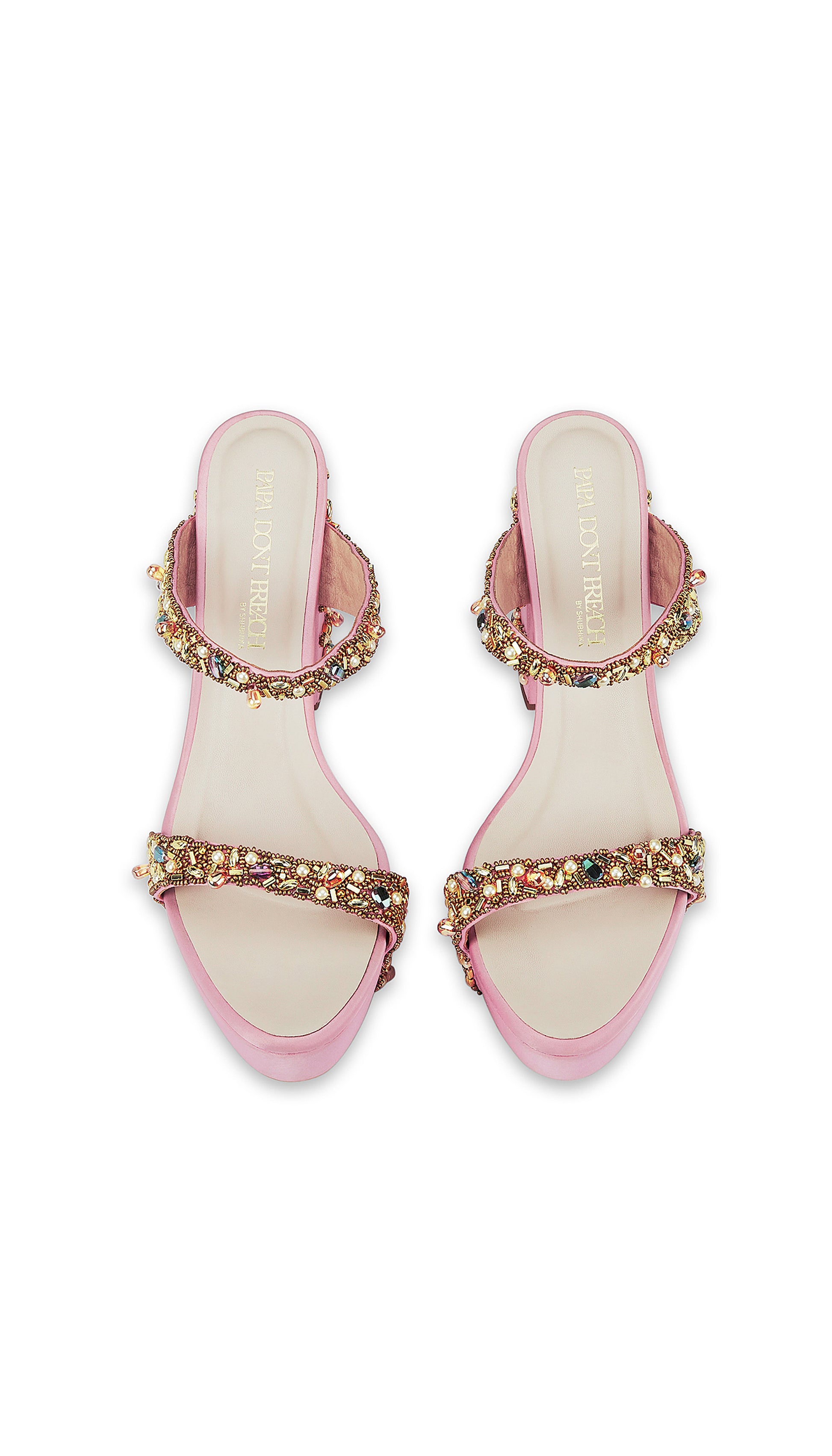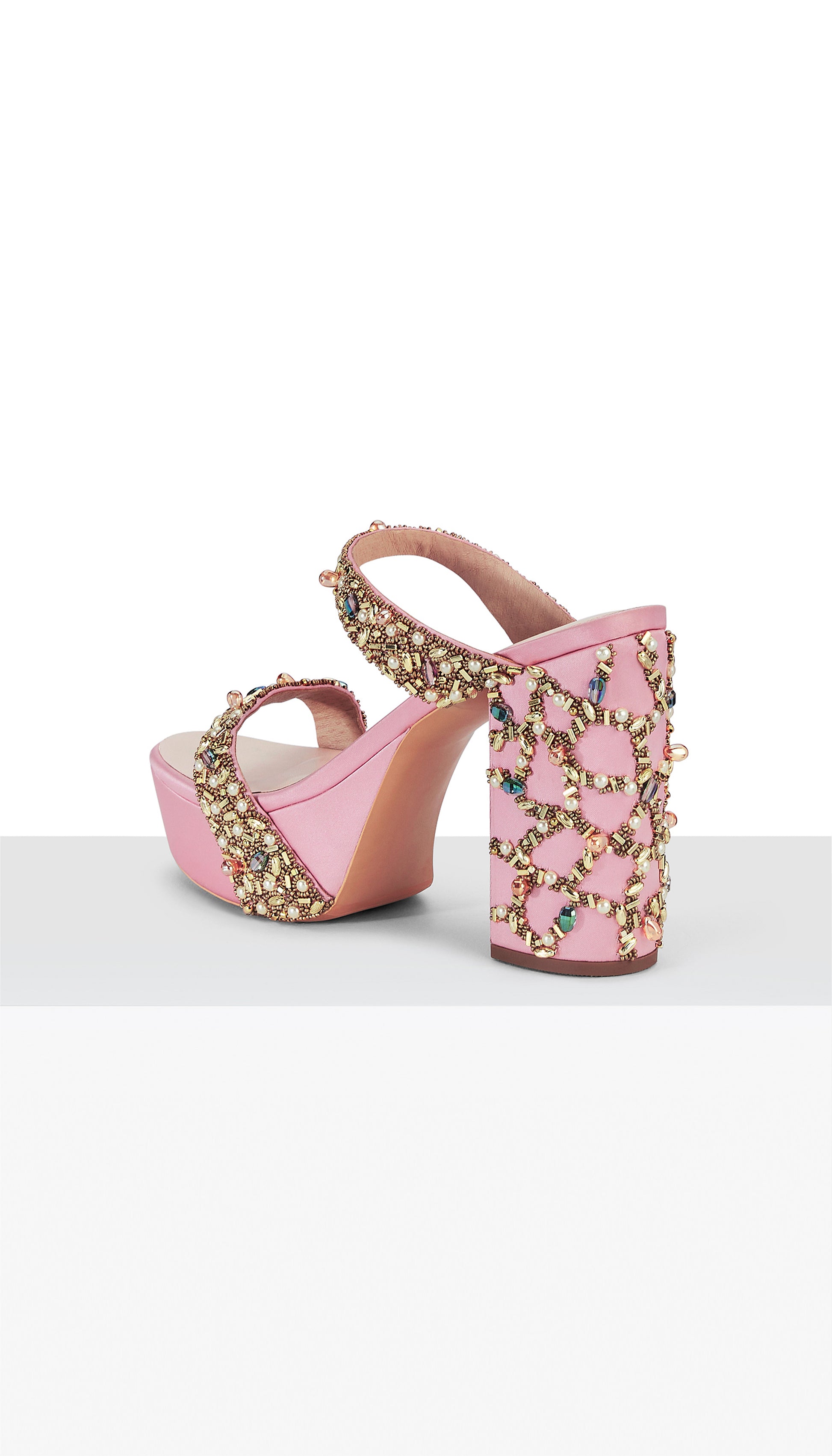 Our Tangled big block satin heels in a soft blush shade is adorned with metal embellishments, pearls, glass beads and 24K gold-plated elements.